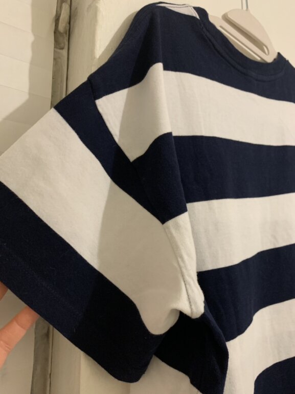 Playera oversize talla grande (G), rayada de blanco con azul Marino. Con aberturas laterales.