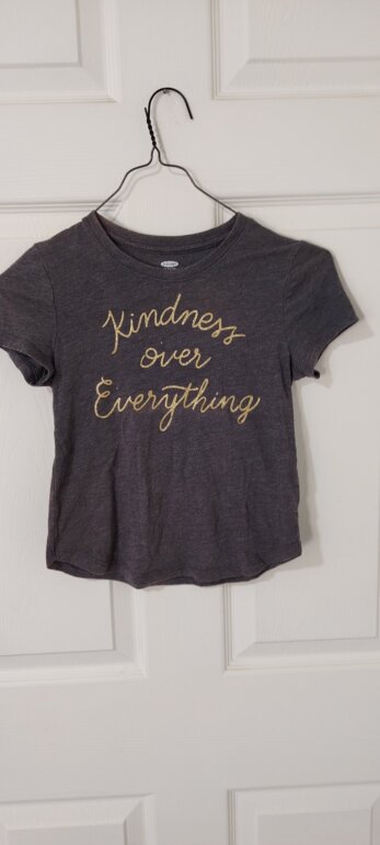 Playera gris con letras doradas, tela ligera, sin detalles.