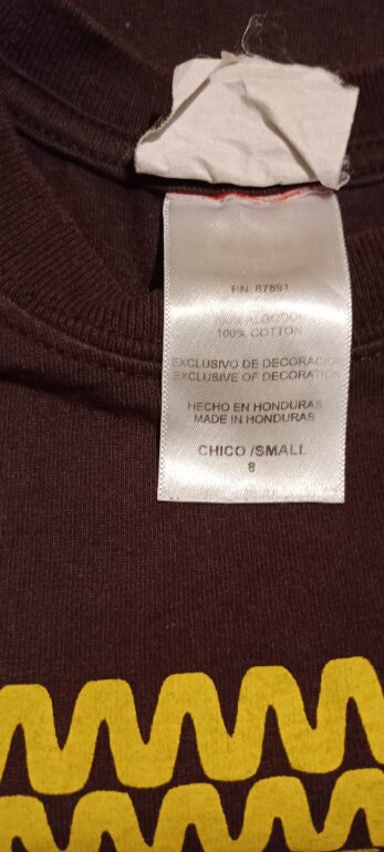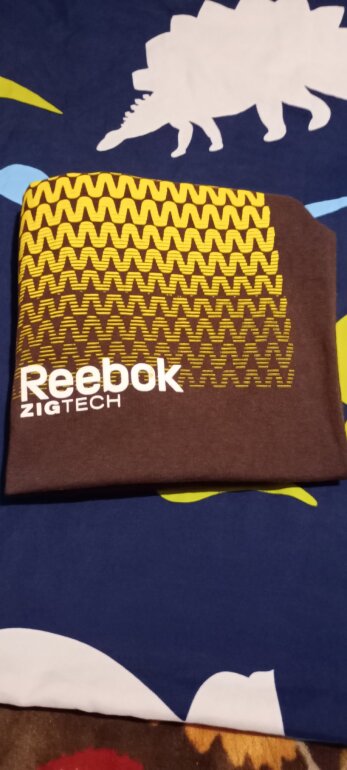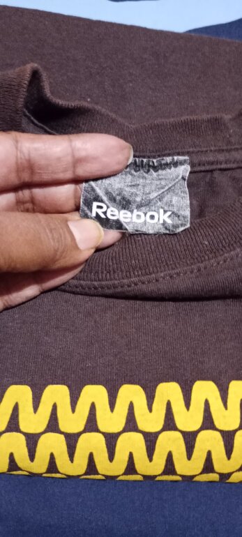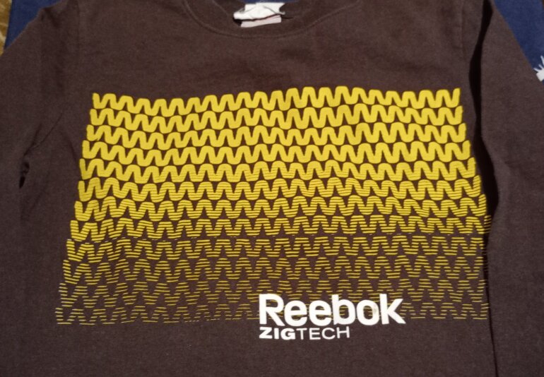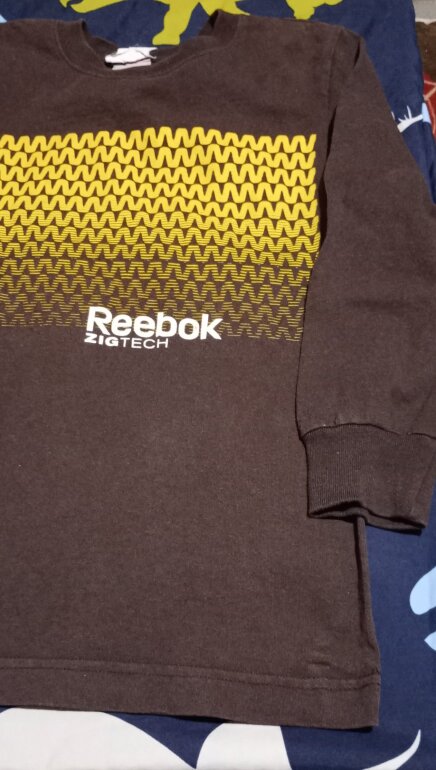 Playera de la marca Reebook color café con estampado en zigzag amarillo, talla s de niño equivalente a la talla 8