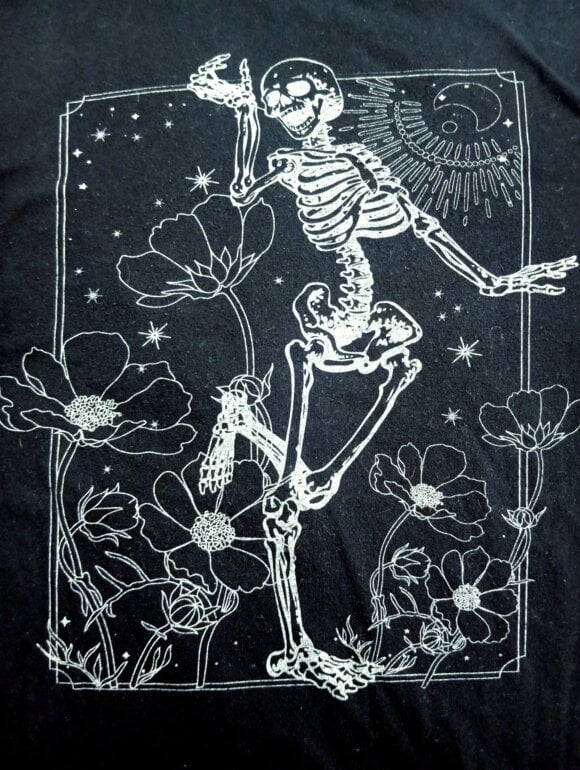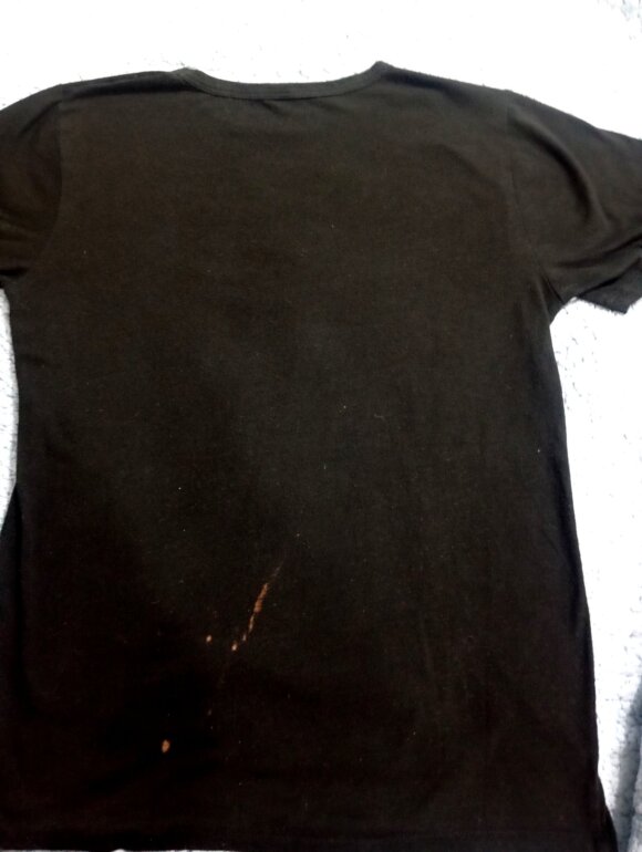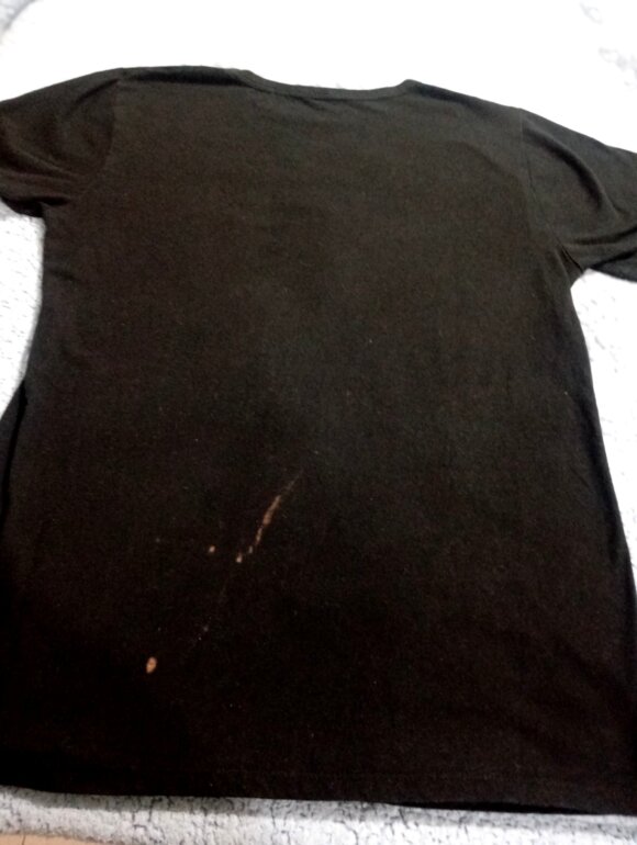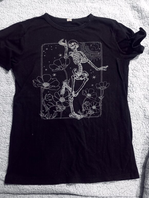 Playera negra con estampado de calavera gris aunque en foto se ve blanco con detalle de cloro en parte trasera 44cm axila y 62 largo