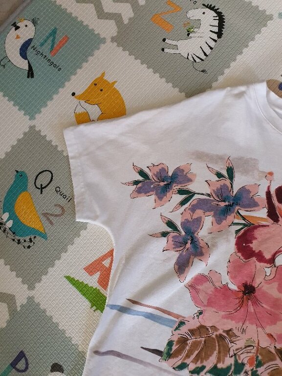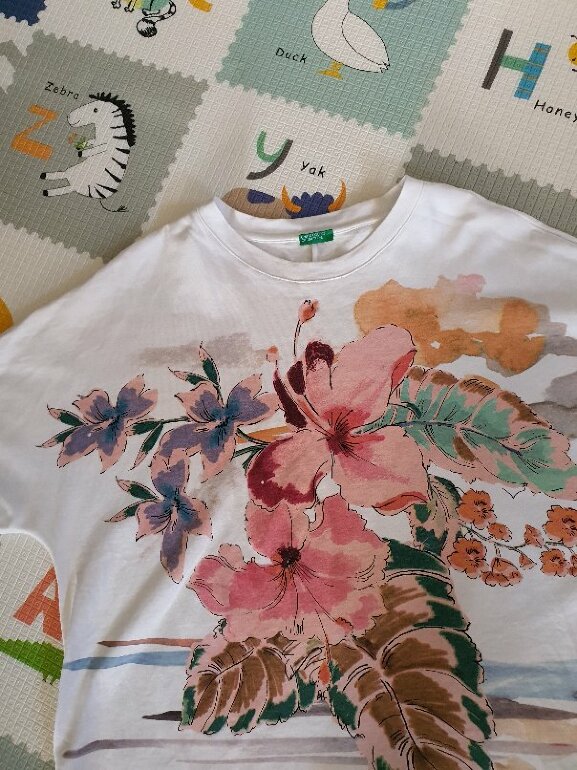 Playera Oversize talla grande, super bonita olor beige con estampado de flores rosas, mamga corta de la marca United Colors of Benetton, nueva sin etiqueta, ojo es mas grande de la talla L, debido a que es Oversize