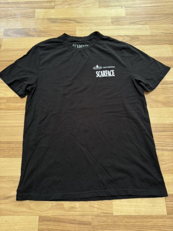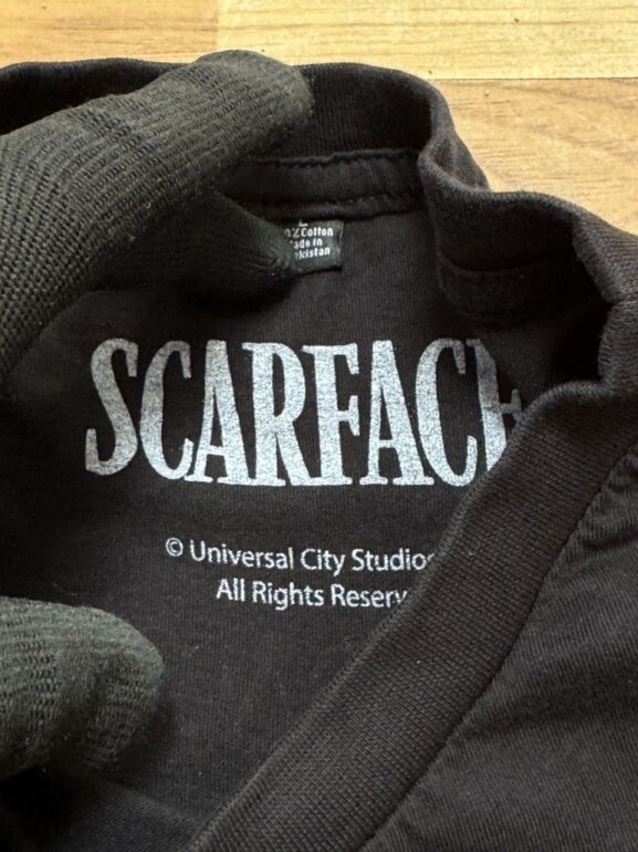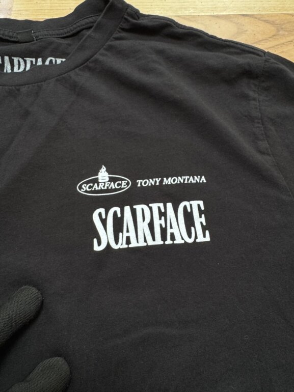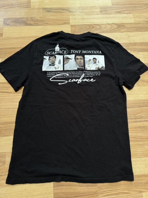 Playera negra icónica de Scarface con estampado grande en la espalda: fotos clásicas de Tony Montana (Al Pacino) fumando puro, frase legendaria sobre el Mariel Harbor 1980 y el American Dream, logo “Scarface” en llamas y firma estilizada. Frente limpio. Algodón suave, manga corta, estilo vintage/rap/urban.