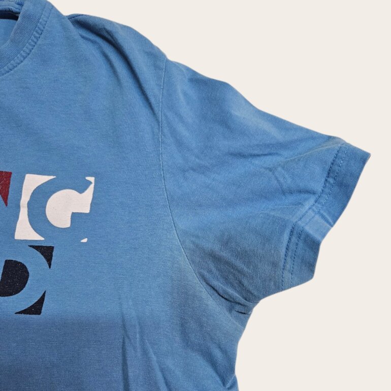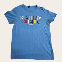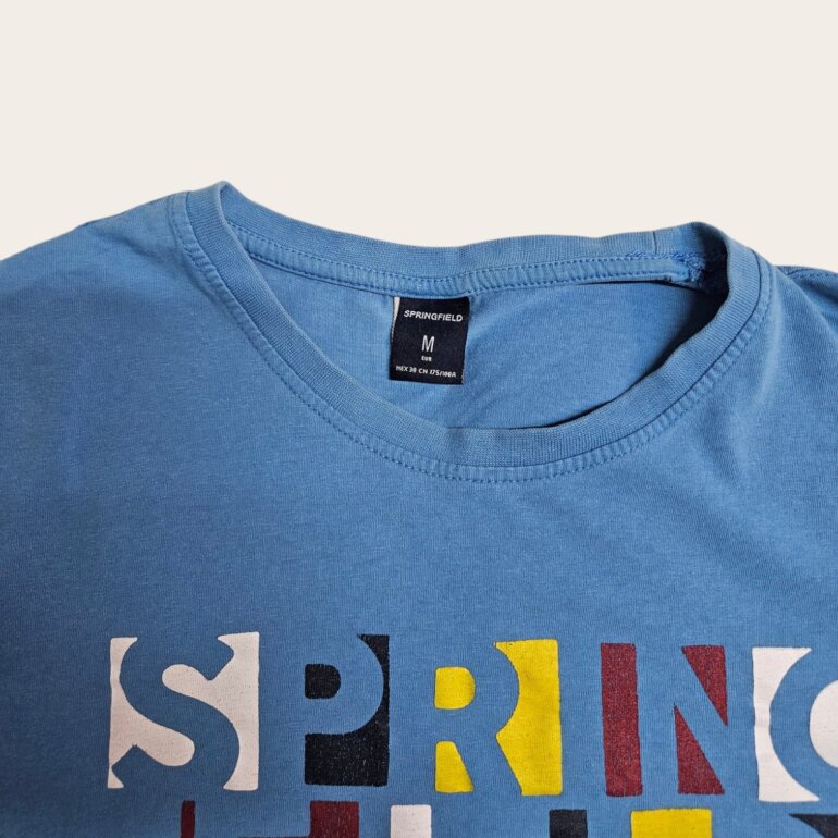 Playera de algodon manga corta MARCA Springfield cuello redondo. No tiene detalles importantes pero es de uso asi que las axilas estan manchadas, supongo puede quitarse .Es talla M de hombre. Es color azul con estampado