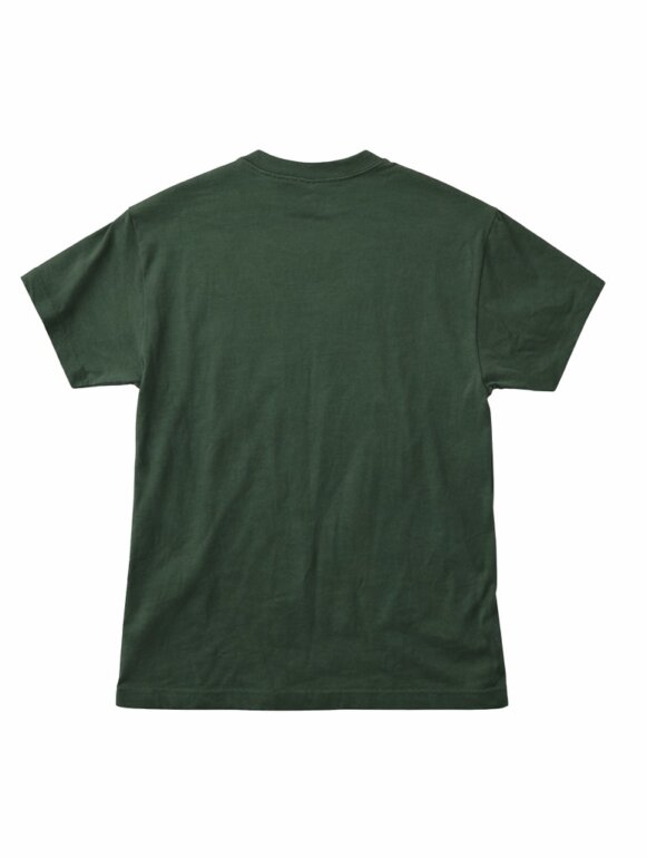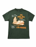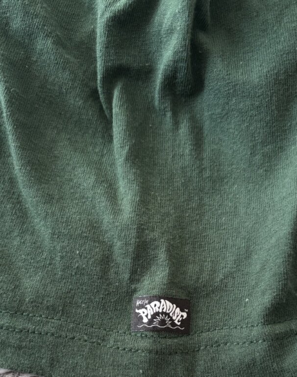 Playera color verde bosque con diseño gráfico al frente en tonos naranja y blanco. Estilo vintage con ilustración llamativa y tipografía retro.