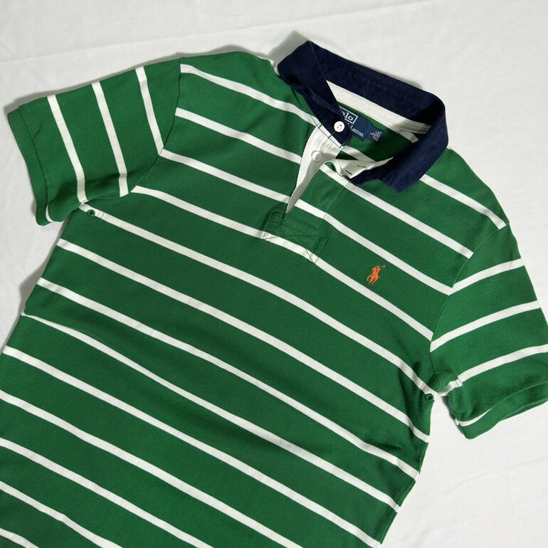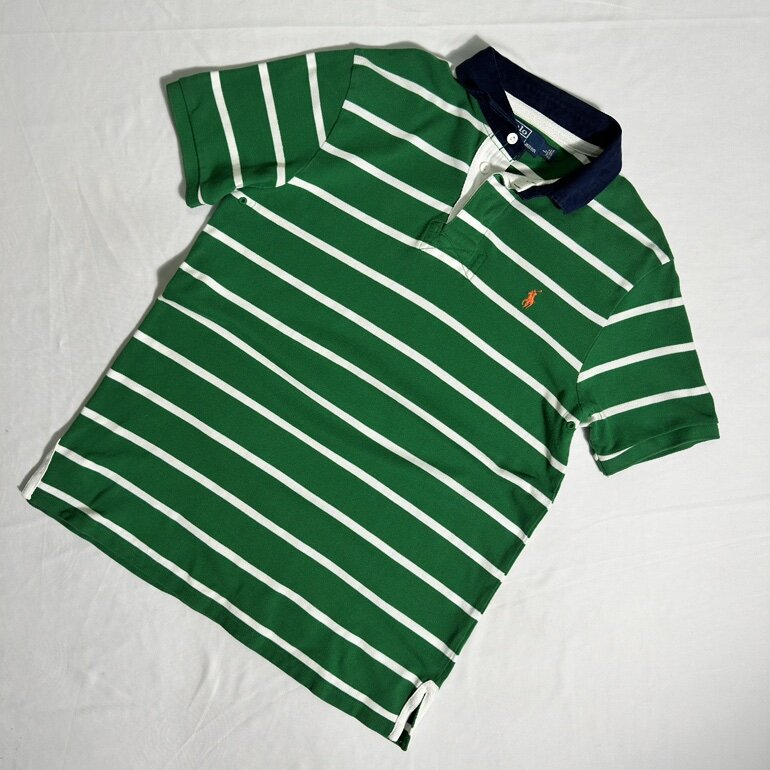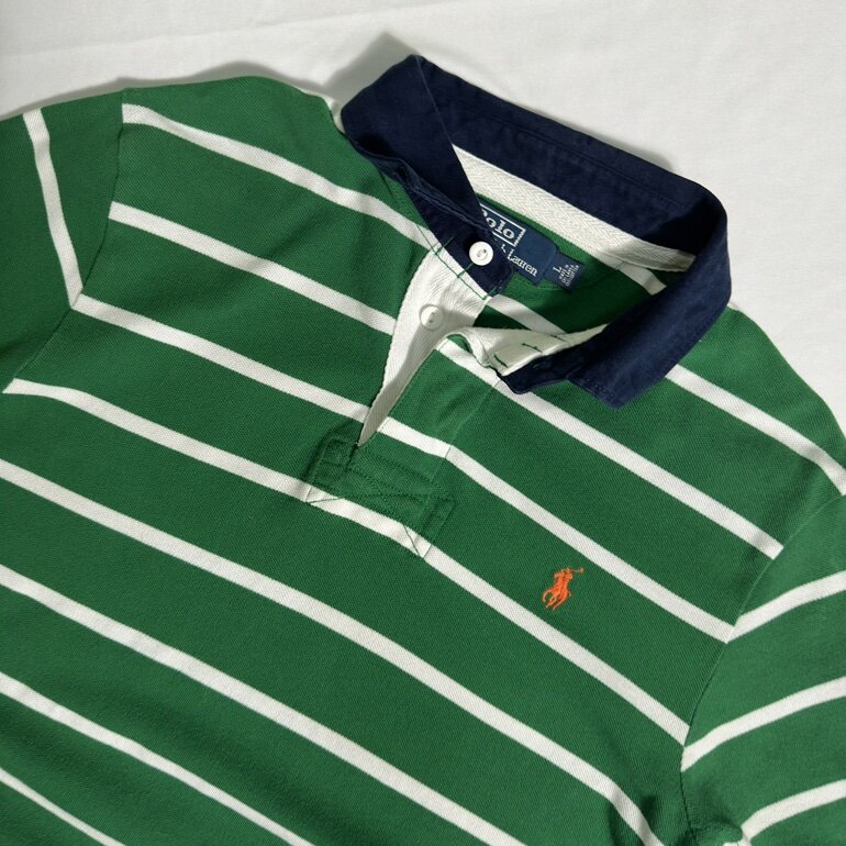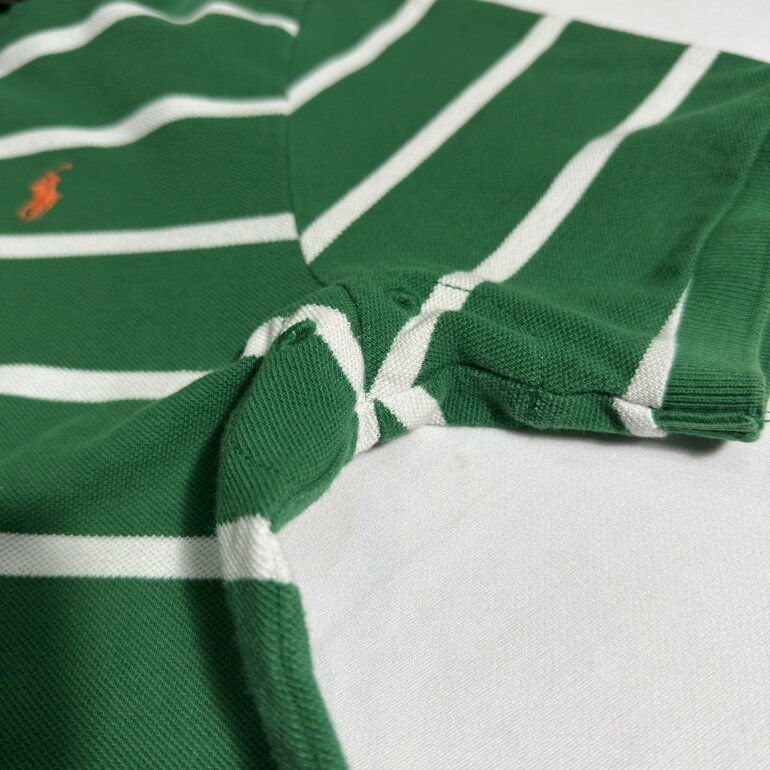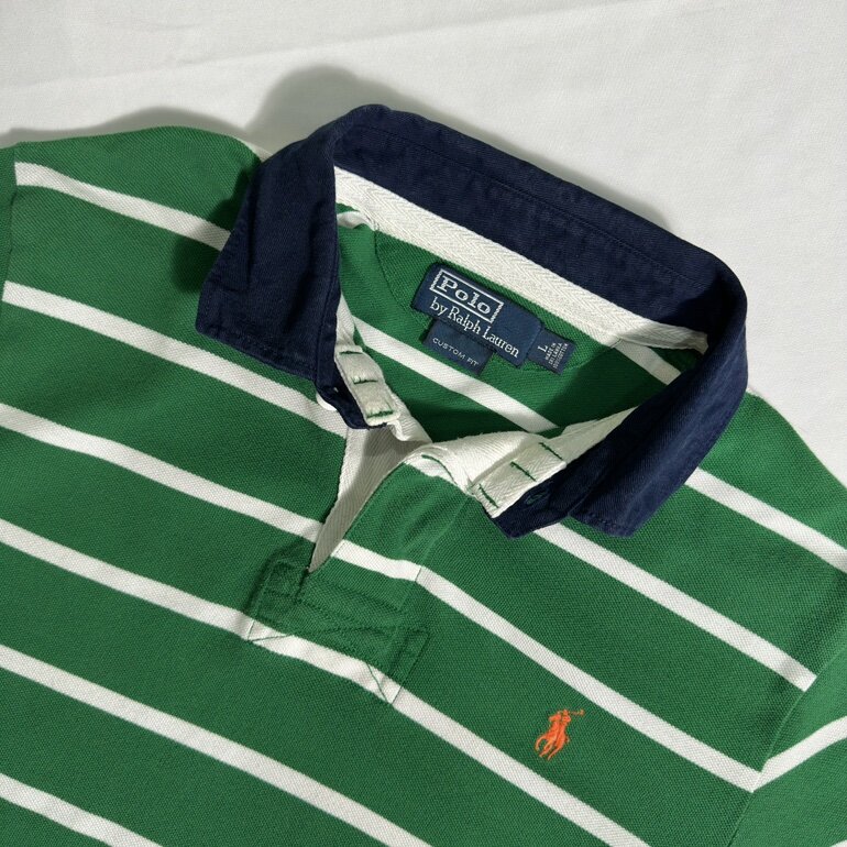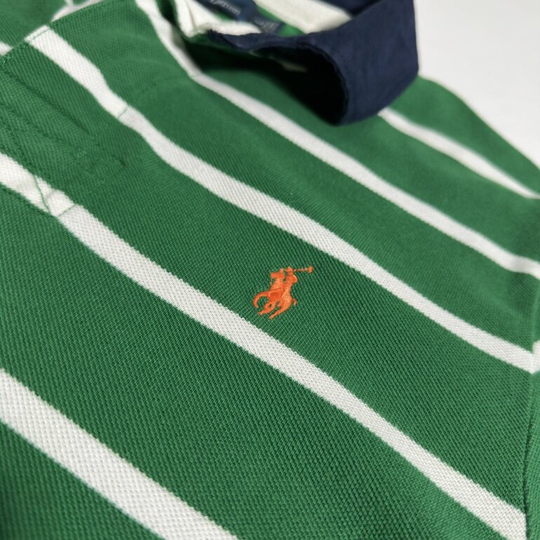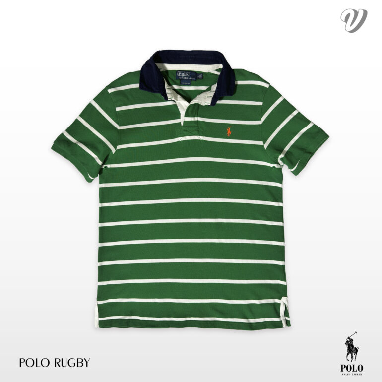 Un clásico de Polo Ralph Lauren, prenda icónica de la marca con un toque clásico, diseño de fondo verde con lineas blancas marcando el contraste, corte robusto, inspirado en el deporte del Rugby adaptado a una moda urbana.