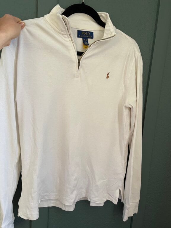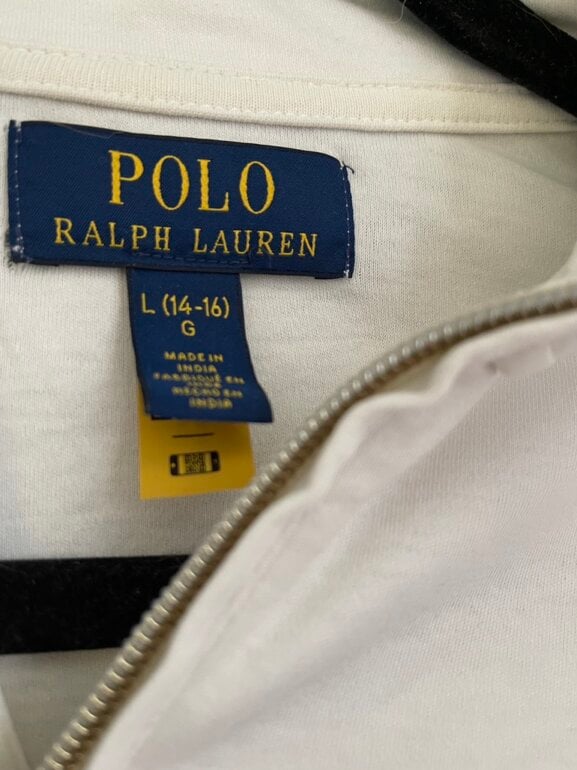 Sudadera (tela delgada, tipo playera manga larga) color blanca, Polo Ralph Lauren talla L (14-16). Zíper frontal.