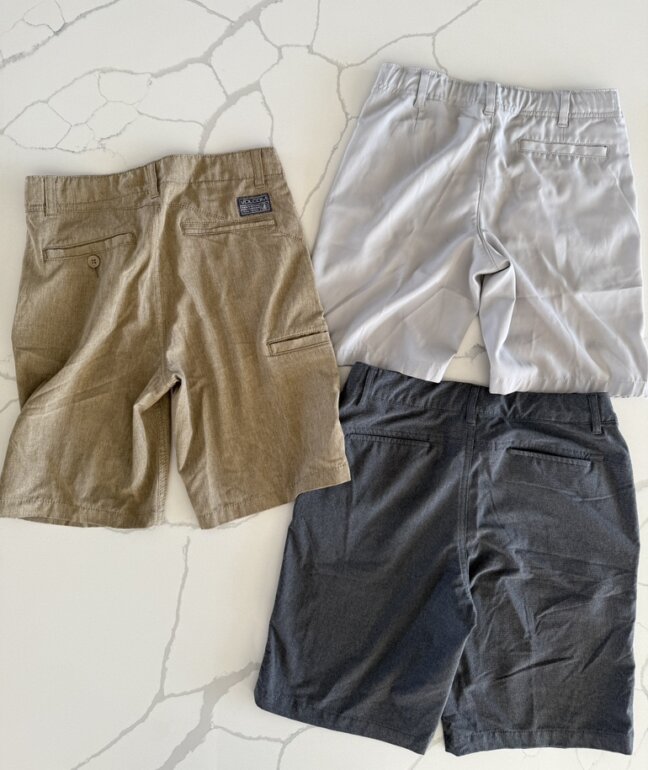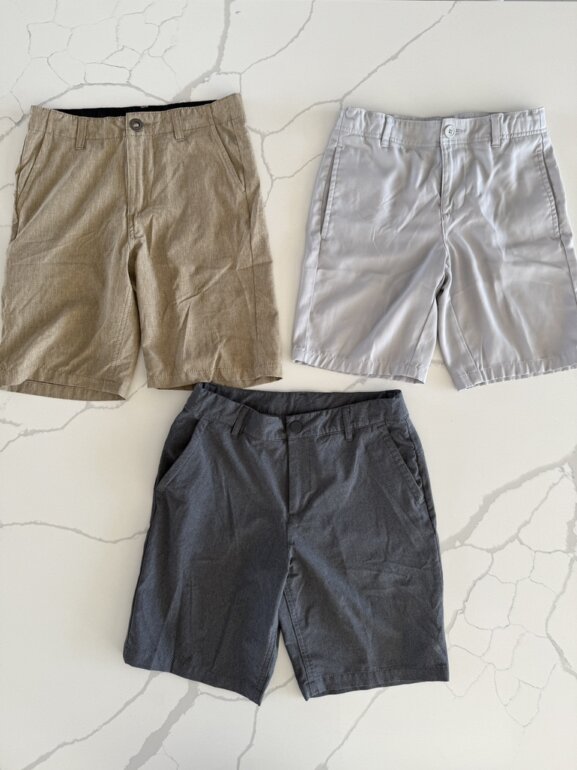 Incluye tres short de vestir se utilizaron para jugar golf pero se pueden utilizar para vestimenta casual mismas tallas marcas americanas . Se compraron en tienda academy UsA