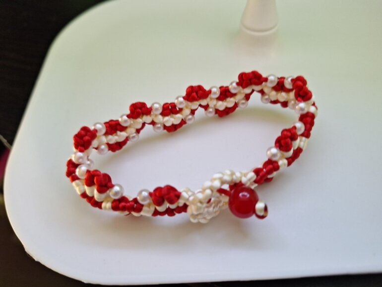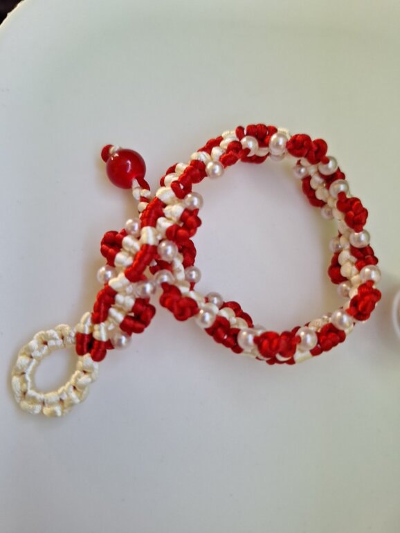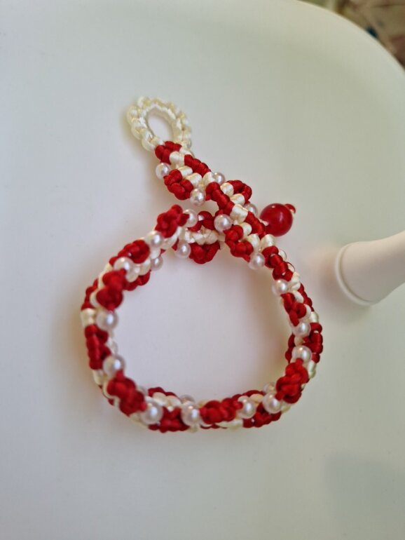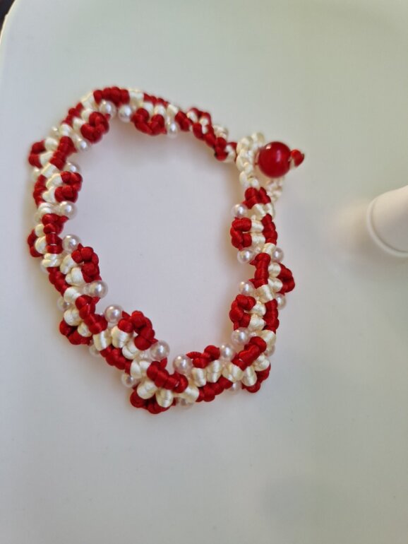 PULSERA DE COLA DE RATÓN TEJIDA EN MACRAMÉ CON CUENTAS PERLADAS Y ROJA. MIDE 20 CM