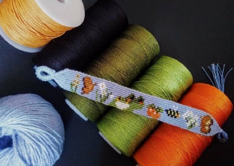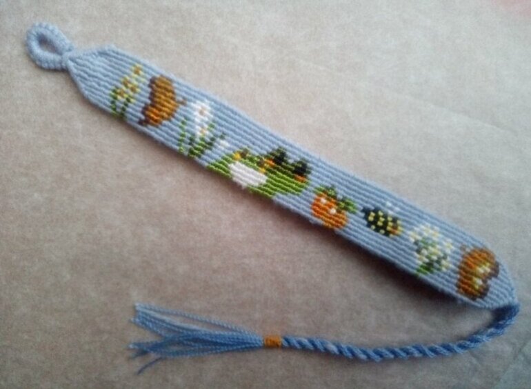Pulsera tejida a mano, macramé, con diseño de ranas, mariposas, flores, abeja y naranjas. 13 Cuerdas base 9 colores 3 días de elaboración
