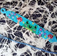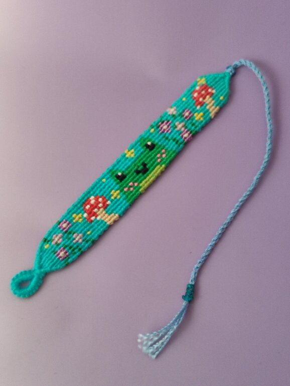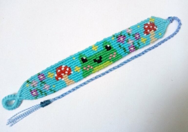 Pulsera tejida a mano, macramé, diseño de rana con hongos y flores
