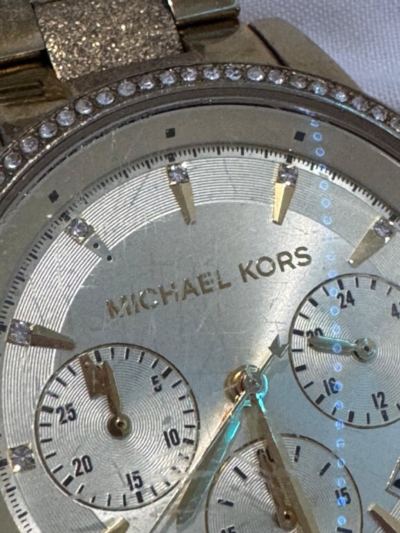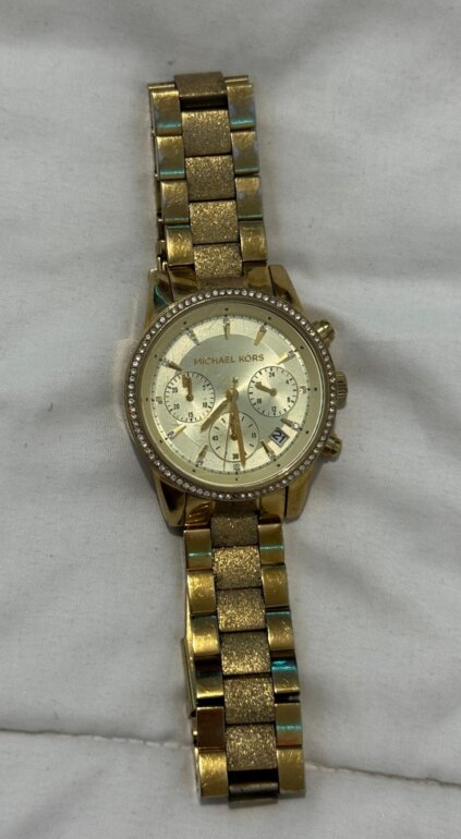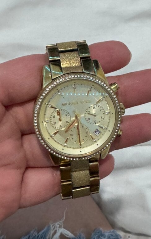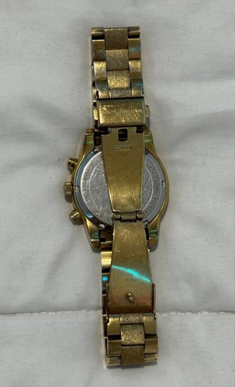 Reloj dorado con pedrería alrededor y extensible metálico con pilas incluidas, diseño elegante