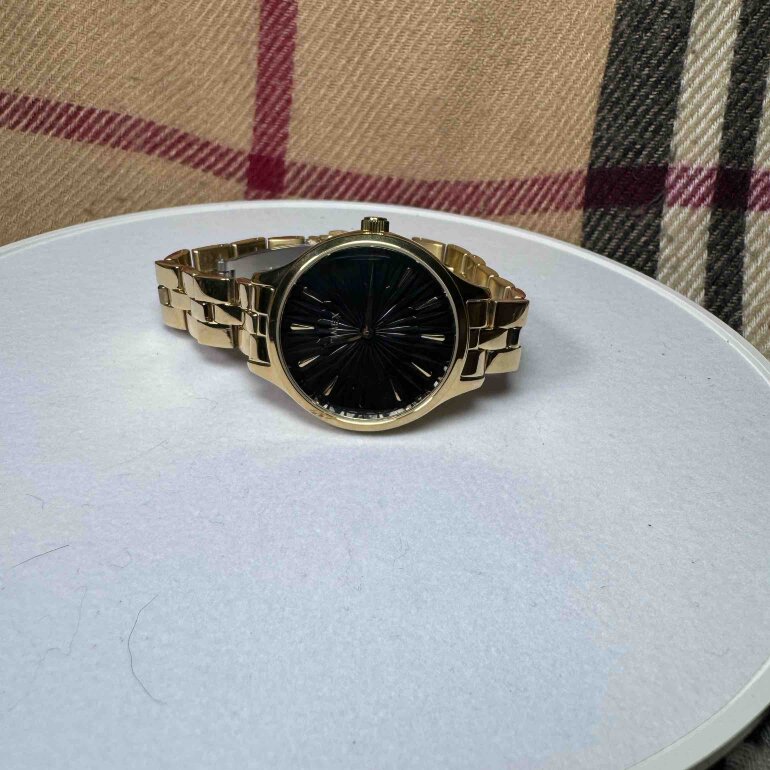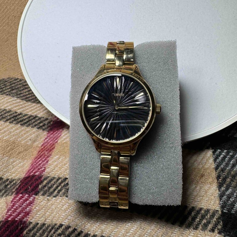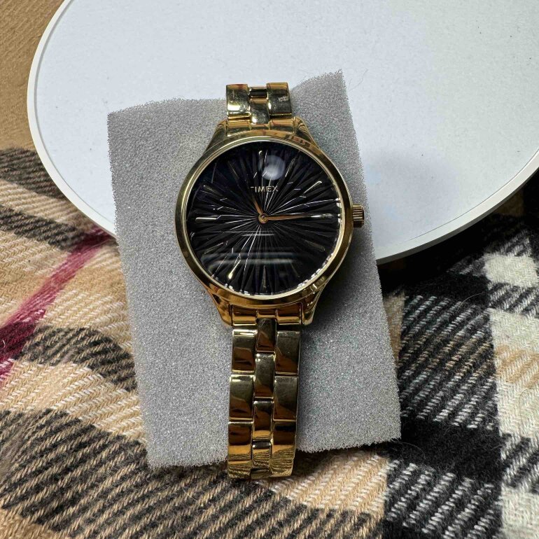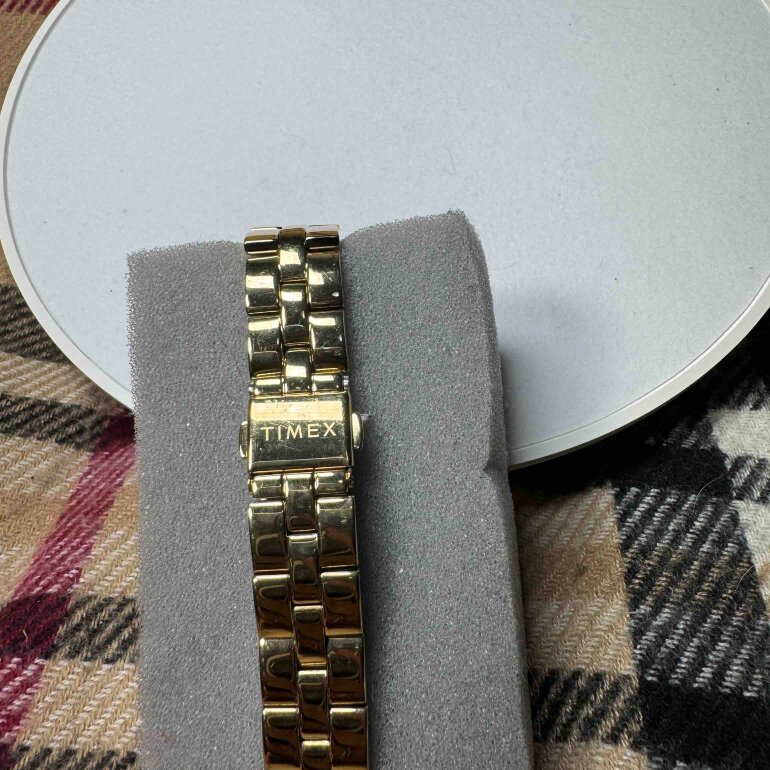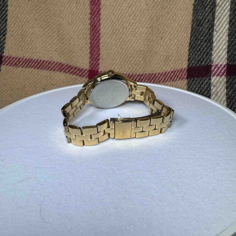 #201. Reloj marca timex, color del extensible dorado y en acero inoxidable, y caja en color negro tipo floreado, sin estuche, modelo TW2V06200. NO ACEPTO OFEETAS DEL 50%