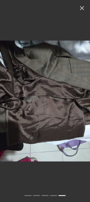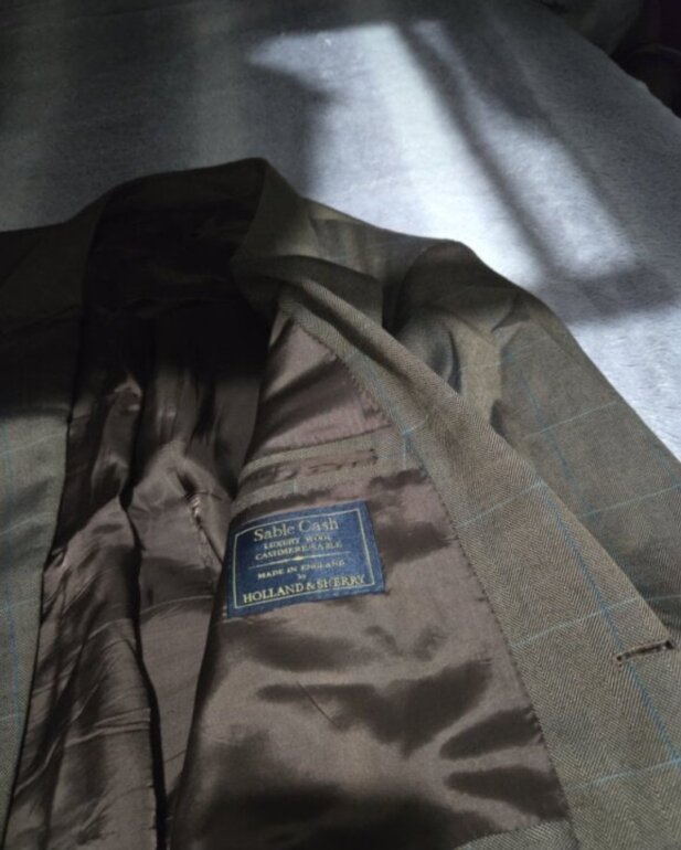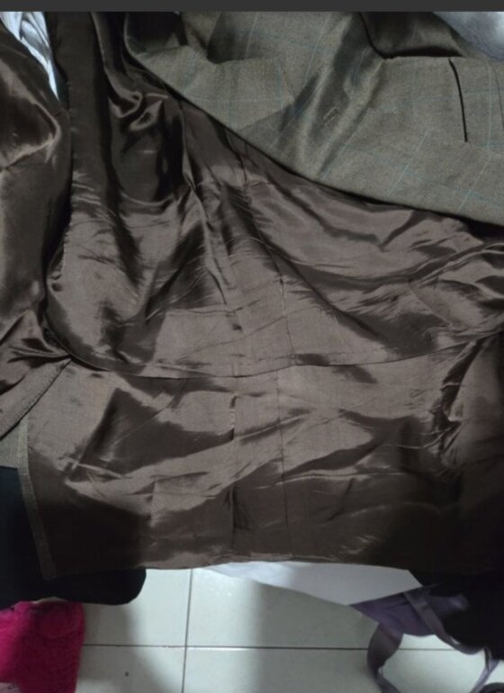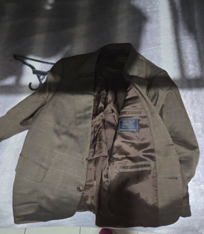 Saco marca Holland & Sherry Color café Talla 50R Descocido por la parte de adentro y por fuera tiene una rasgadura de 1 a 2cm marcado en la imagen, mide 55cm de axila a axila