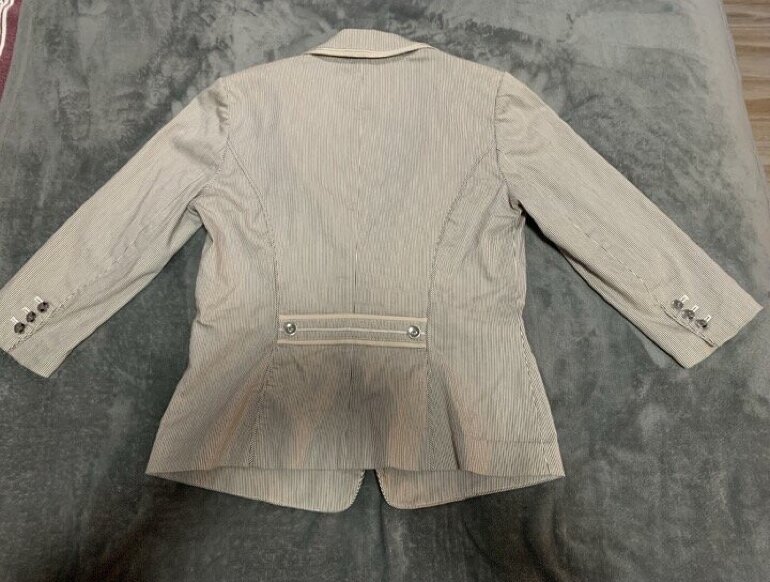 Saco a rayas con botones decorativos en la parte trasera, sus mangos son 3/4. Tiene dos bolsas.