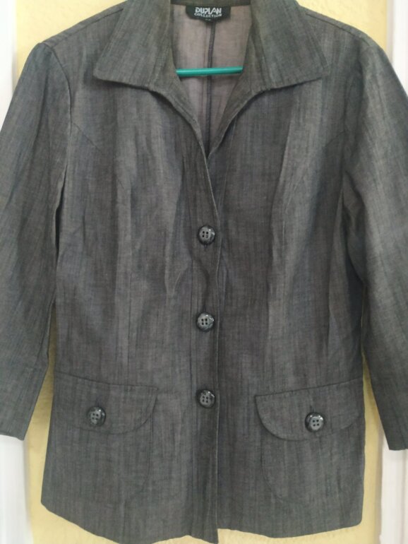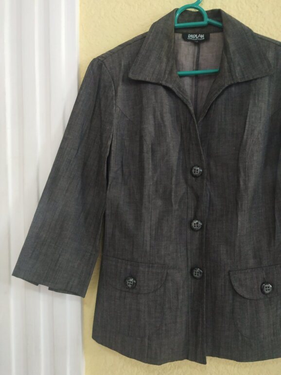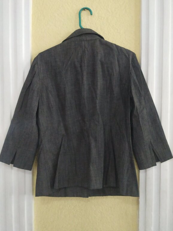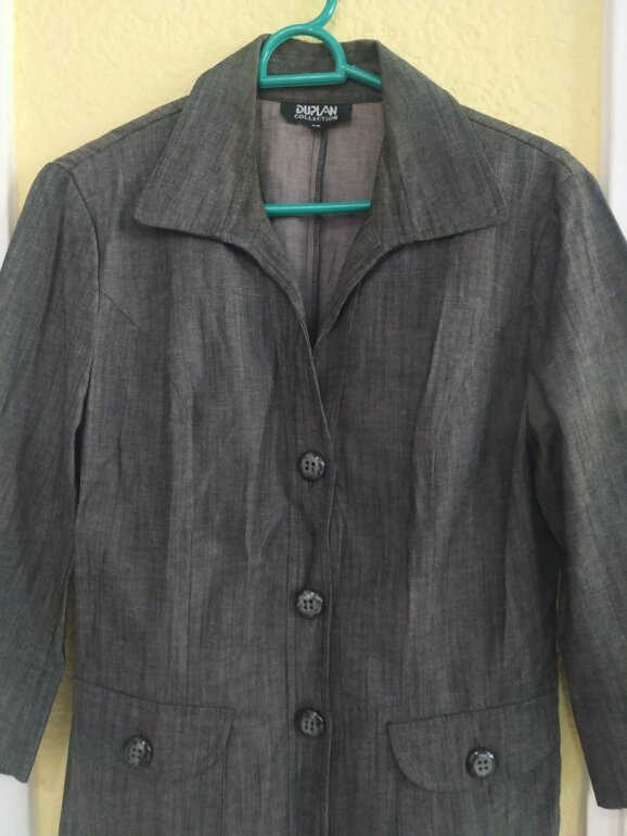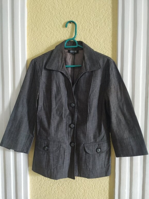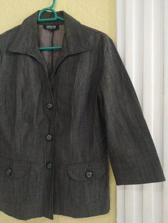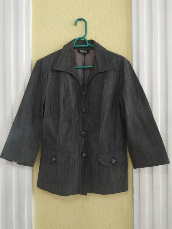 Saco de vestir color gris marca duplan con bolsas delanteras y mangas tres cuartos 🩶 medidas: 42 cm de cintura y 60 cm de largo