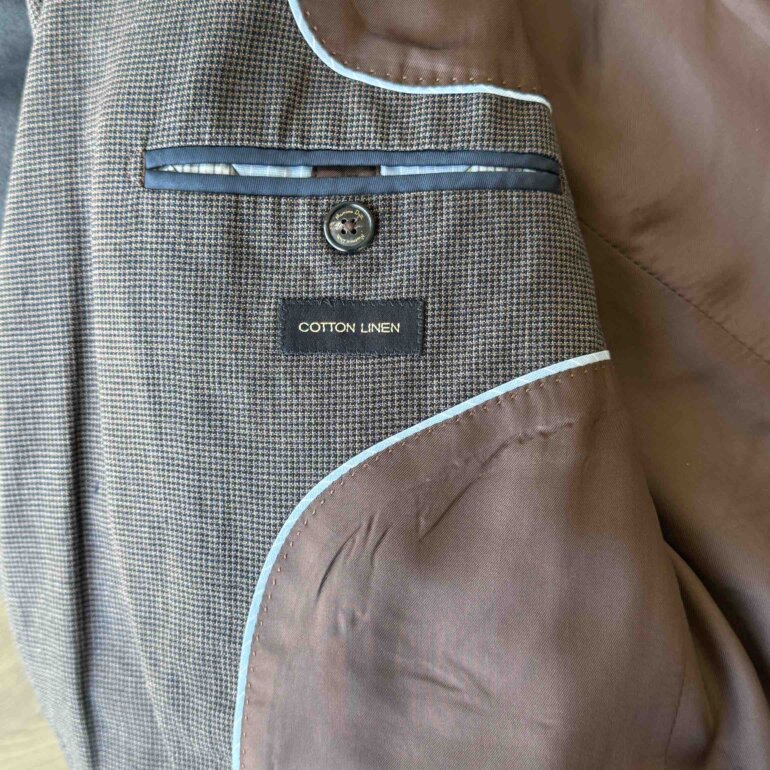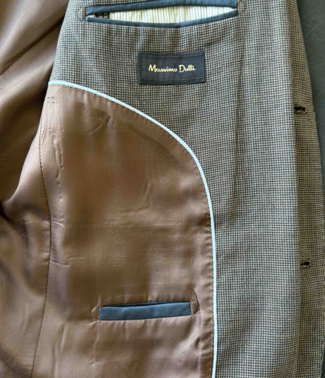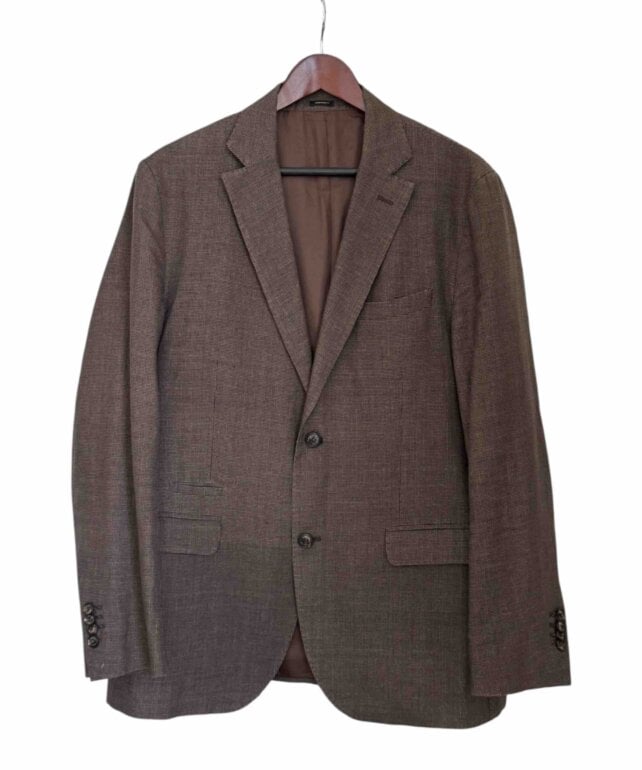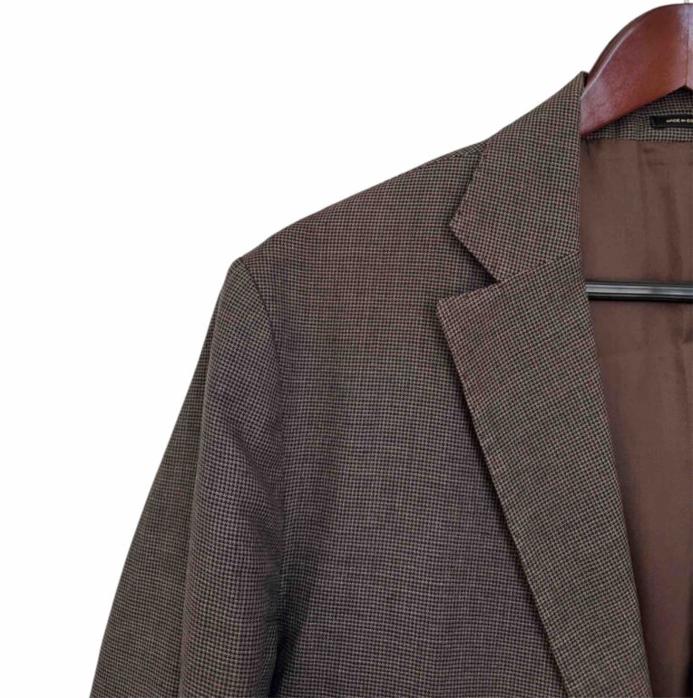 Saco elegante de la marca Massimo Dutti en tono café con microdiseño en patrón pata de gallo, ideal para eventos formales o looks de oficina. Corte clásico con solapa de muesca, dos botones frontales y doble abertura trasera para mayor comodidad. Confeccionado en mezcla de algodón y lino, lo que lo hace ligero y fresco.