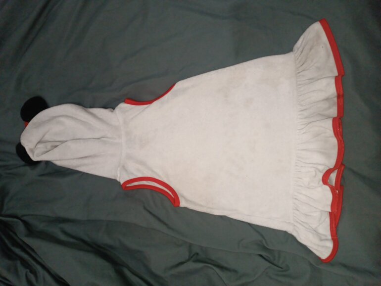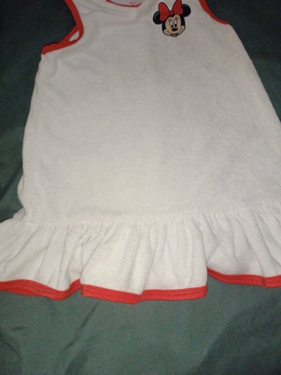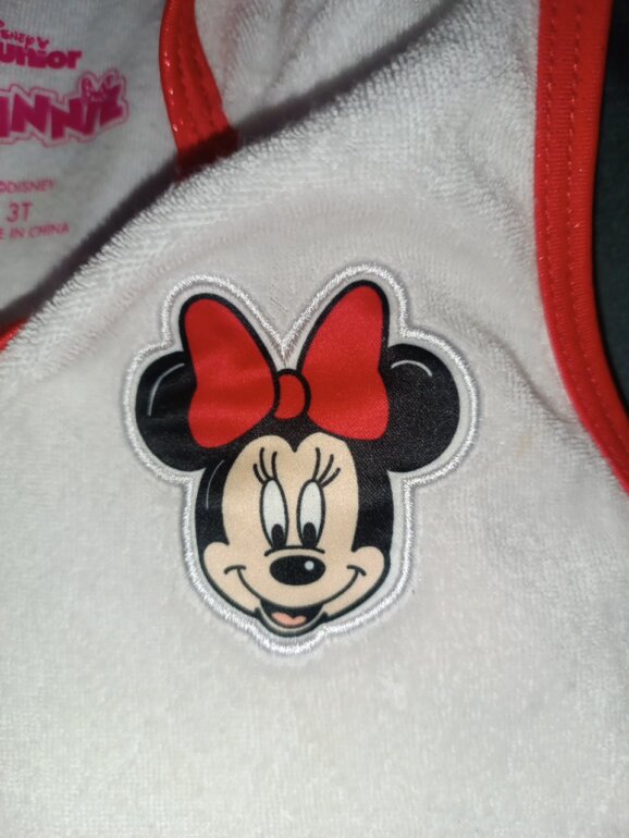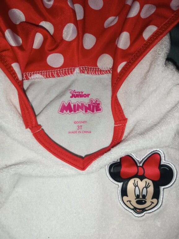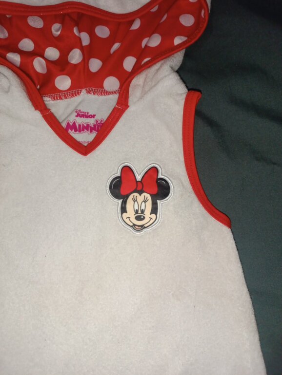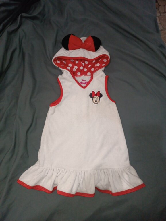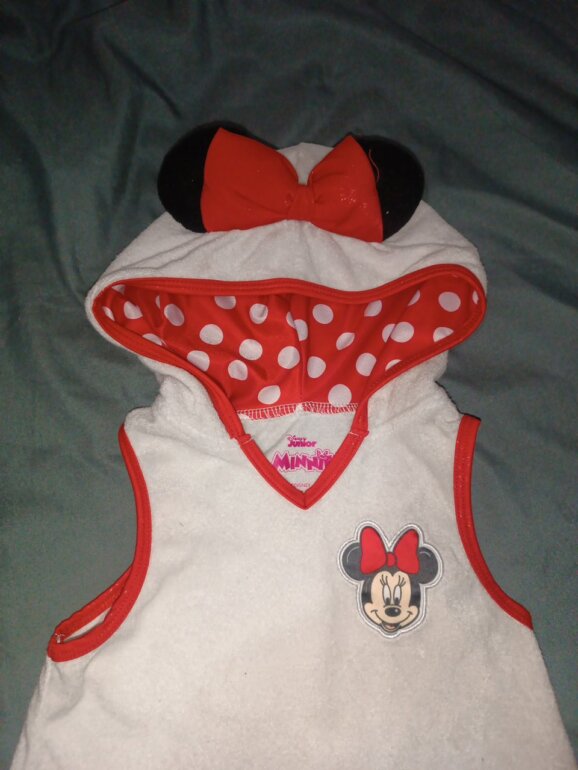 Salida de baño tipo toalla blanca con rojo con capucha con lindo moño de Minnie ,tiene unas manchitas por el uso en la playa.en la última foto se pueden ver no son tan visibles.
