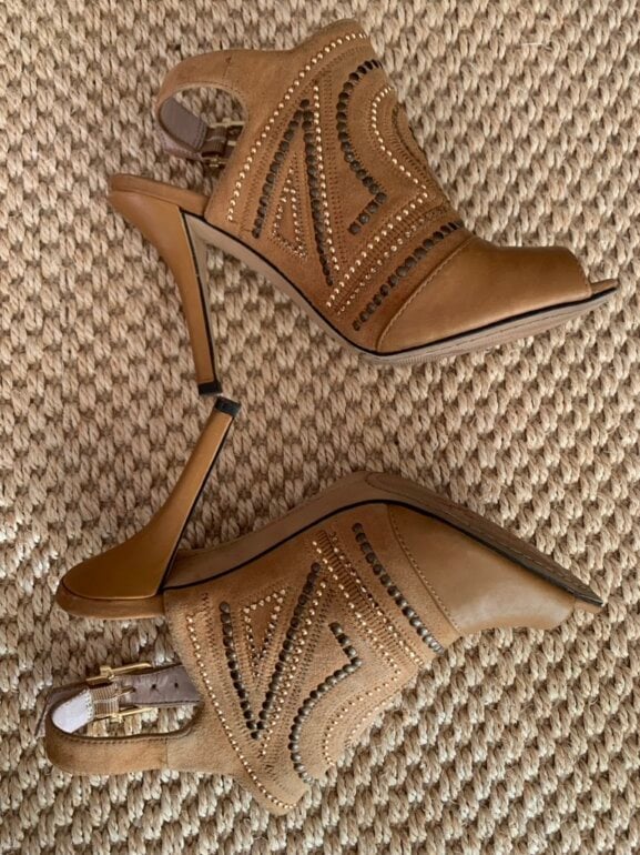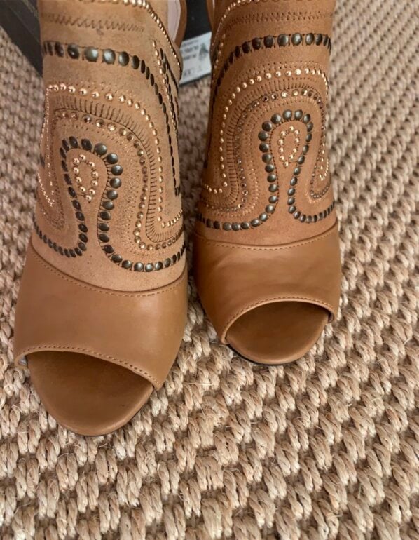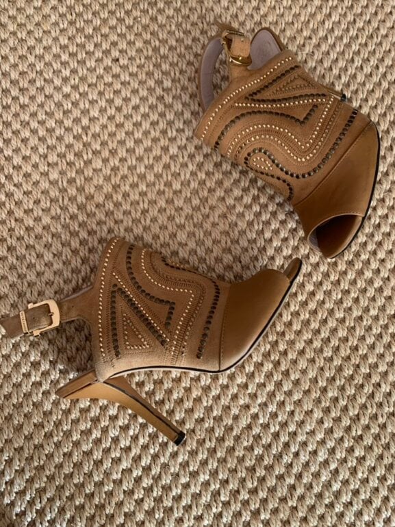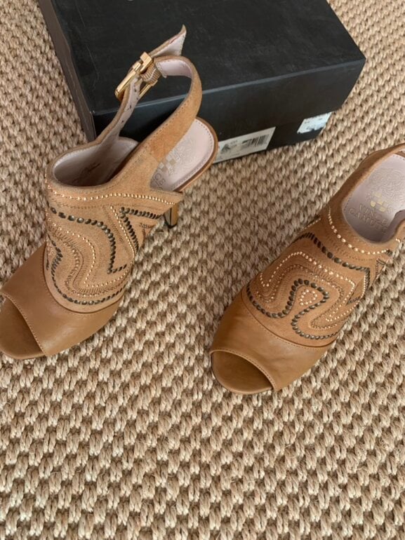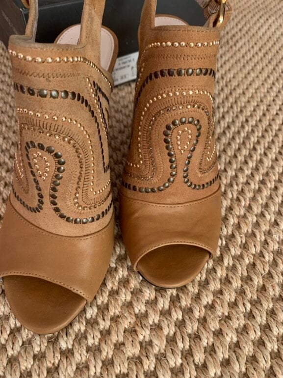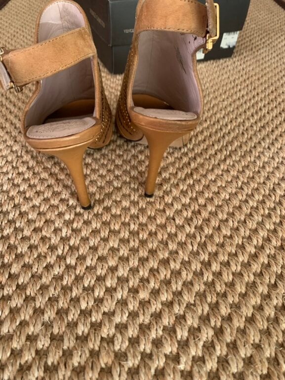 Vince Camuto Sandalias con estoperoles cuero muy comodo tacon y de alto aprox 8 cm… solo falta darle una “boleada” pero no tiene raspones. Acepto ofertas serias en compra inmediata por estafeta solo