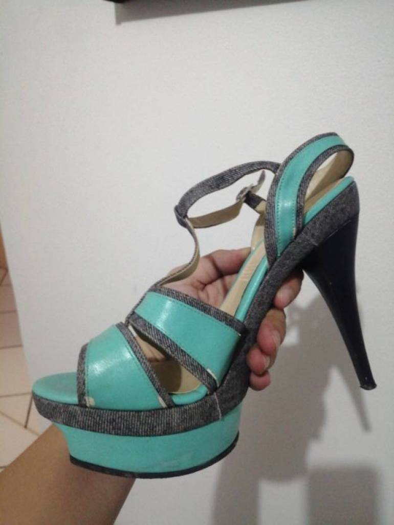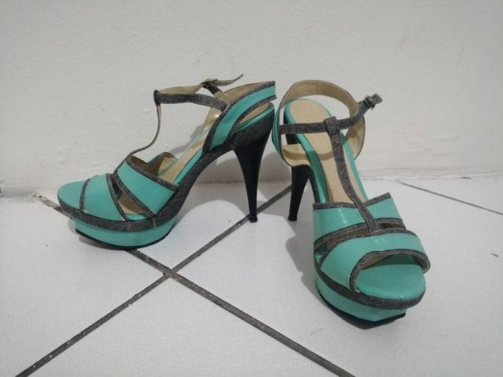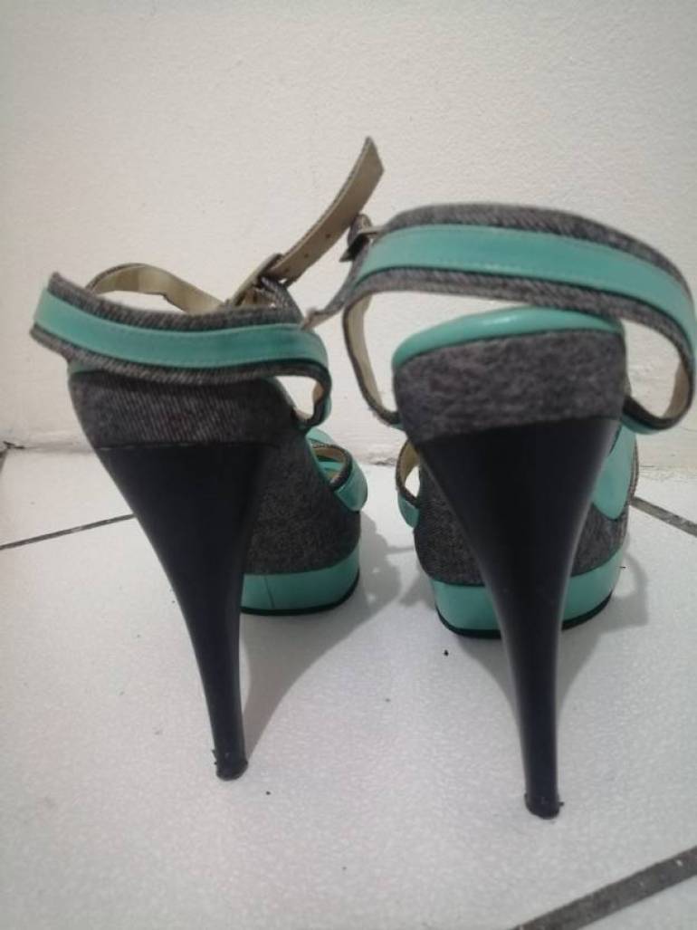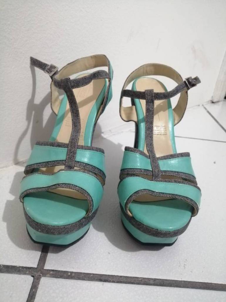 Sandalias de tacon, turquesa con toques de mezclilla, talla 5
