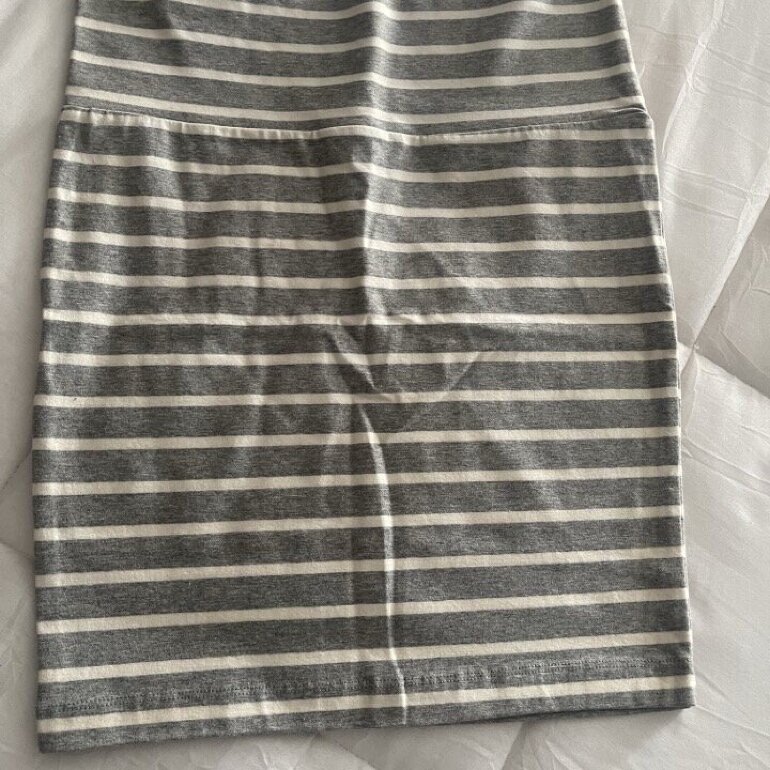 Falda corta, set de 3, color rosa fucsia, azul marino, rayas beige y gris.