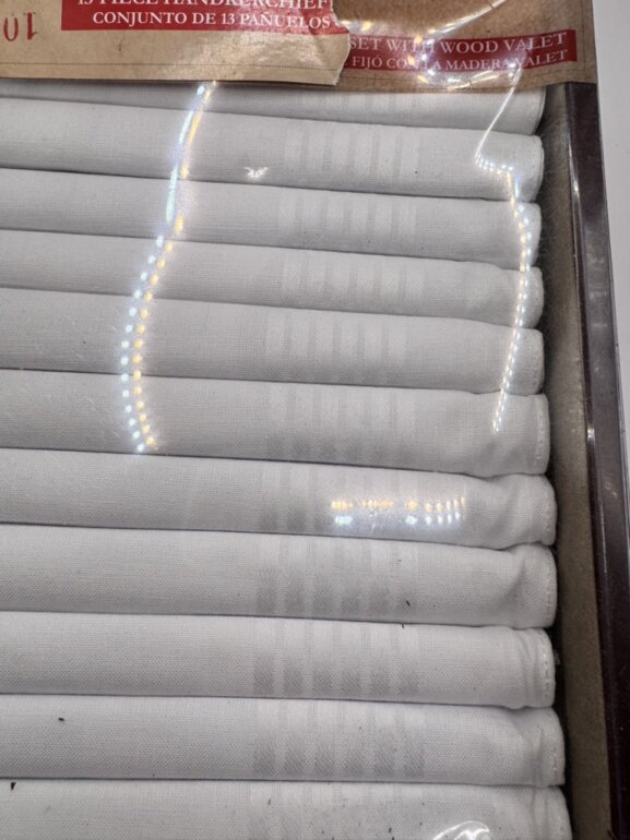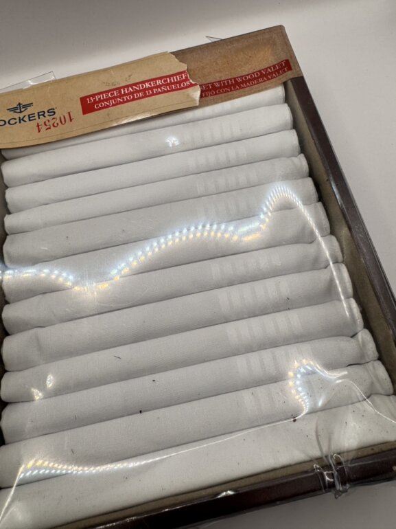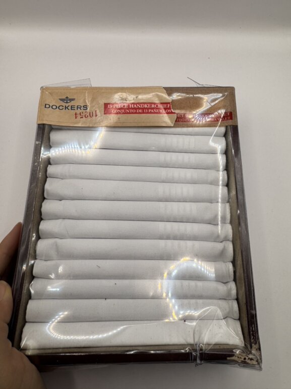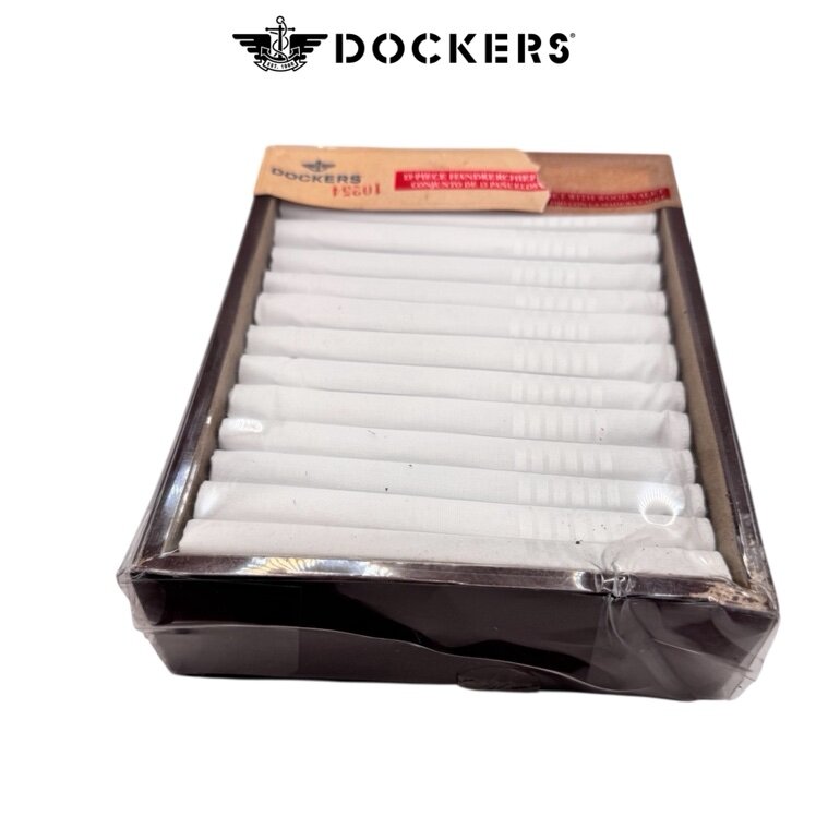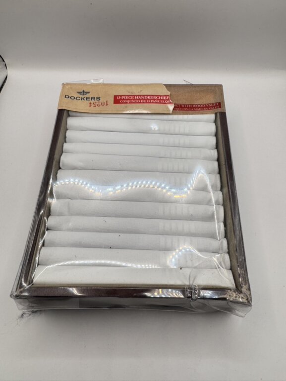 Set de Pañuelos, marca Dockers, color blanco, 13 piezas, caja de madera, la caja tiene un pequeño golpe en una esquina no se ve mucho adjunto fotos, Hermosos y Sofisticados!🤩✨