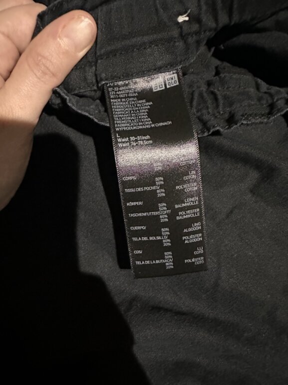 Es talla L pero yo soy talla M y a veces S y lo uso y se ve perfecto por qué es amplio, tiene elástico y botón y aparte un listón que ajusta a tu cintura queda muy bien y es de lino con algodón