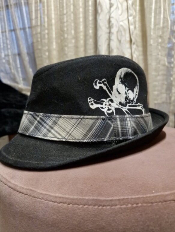 Increible sombrero estilo británico Skull Ska tipo fedora, de fieltro con calavera en un extremo. Sin detalles en excelentes condiciones, para un regalo súper original.