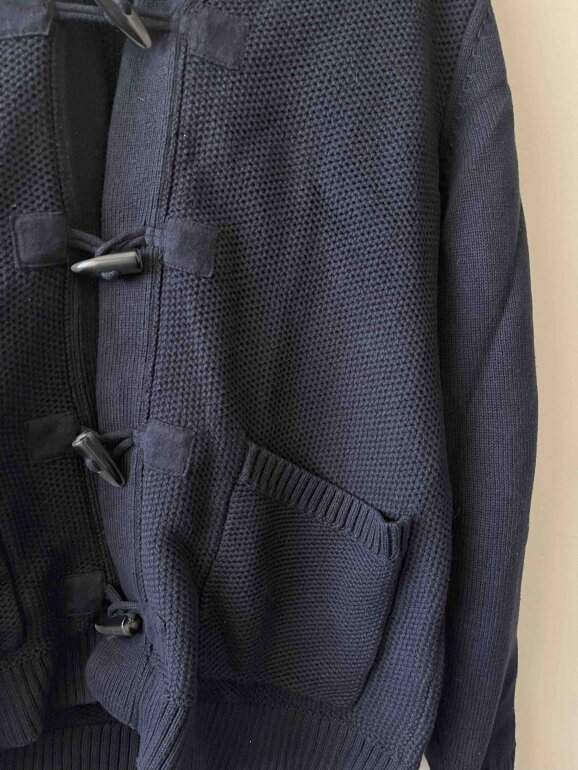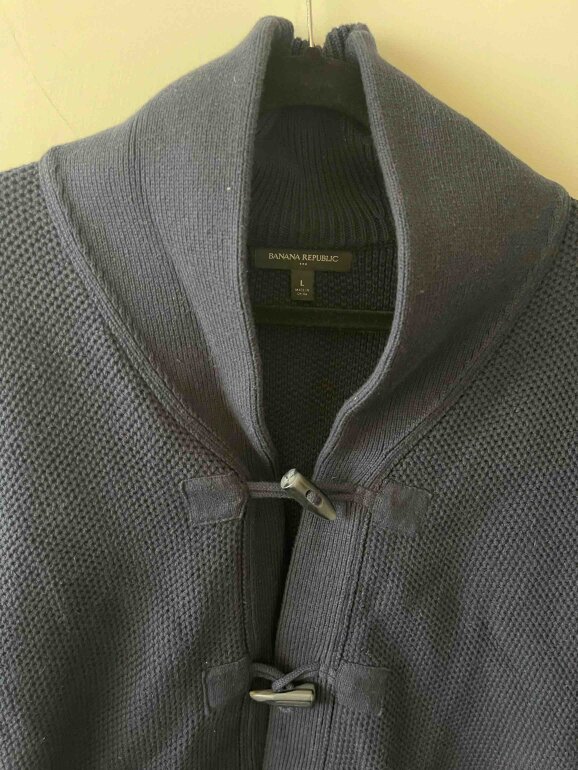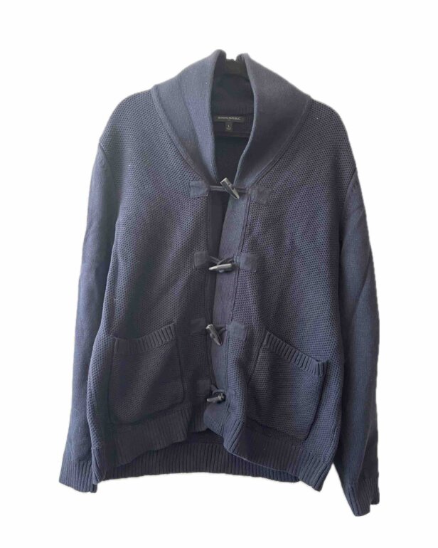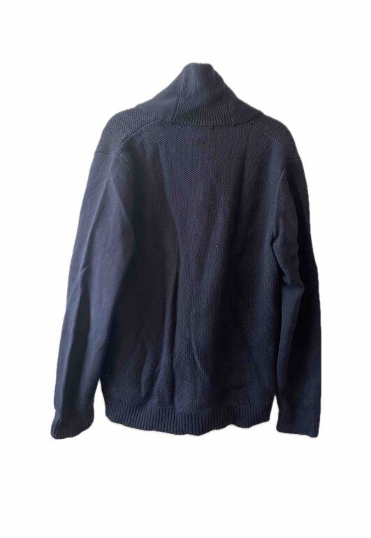 Suéter gordo tipo tejido color azul marino con botones. Dos bolsas al frente y cuello ancho. Es calientito. No tiene detalles. Medidas (axila:56cm)(largo:79cm)
