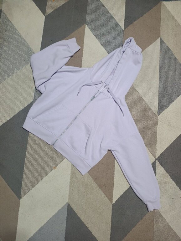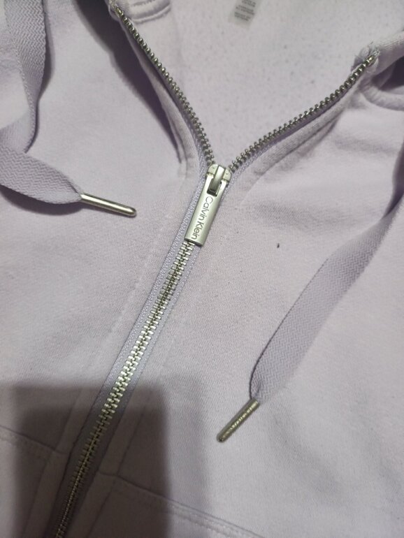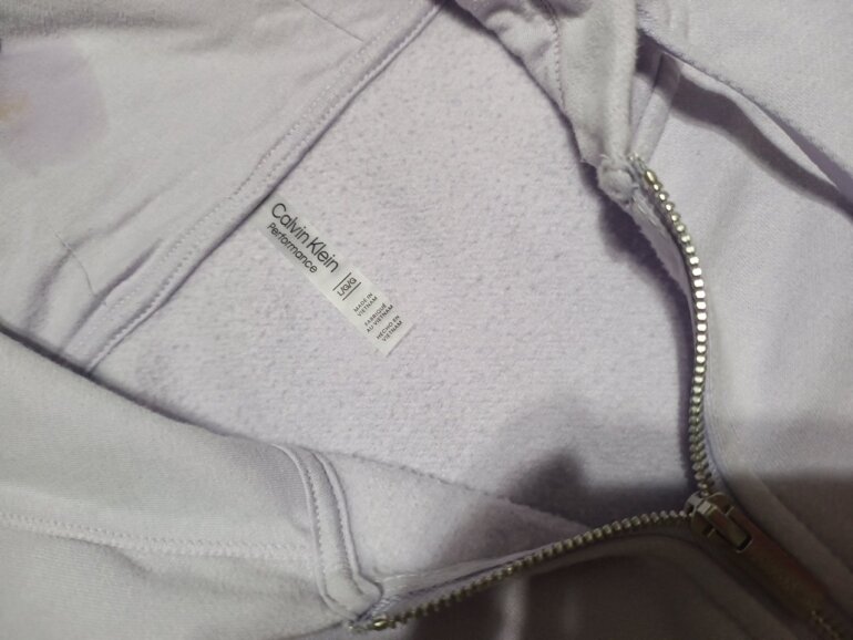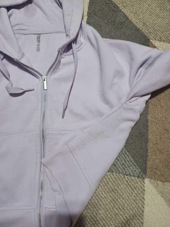 Esta es una sudadera con capucha y cremallera completa de felpa para mujer de Calvin Klein Performance, en color lavanda o morado claro. El logotipo de Calvin Klein está bordado en la manga izquierda.