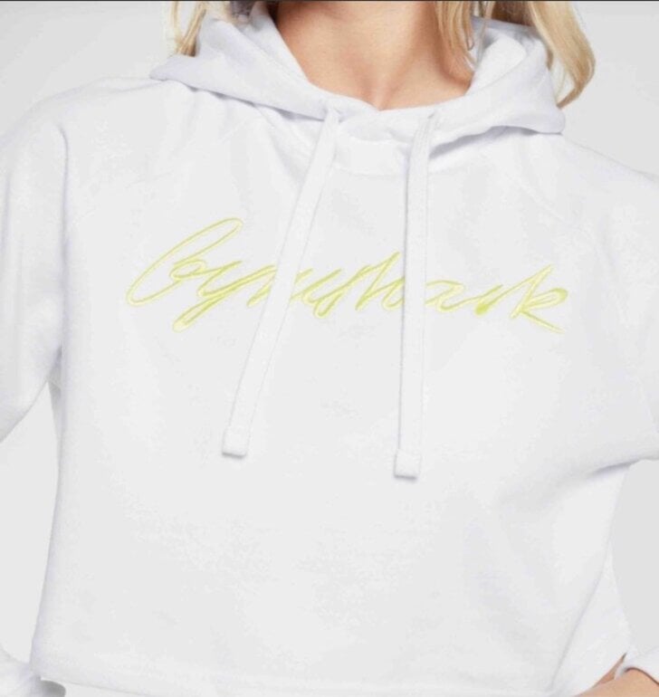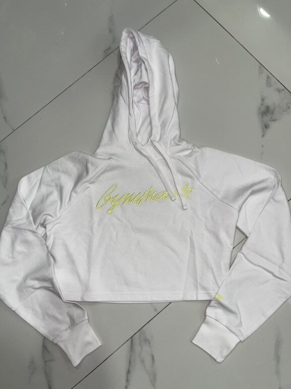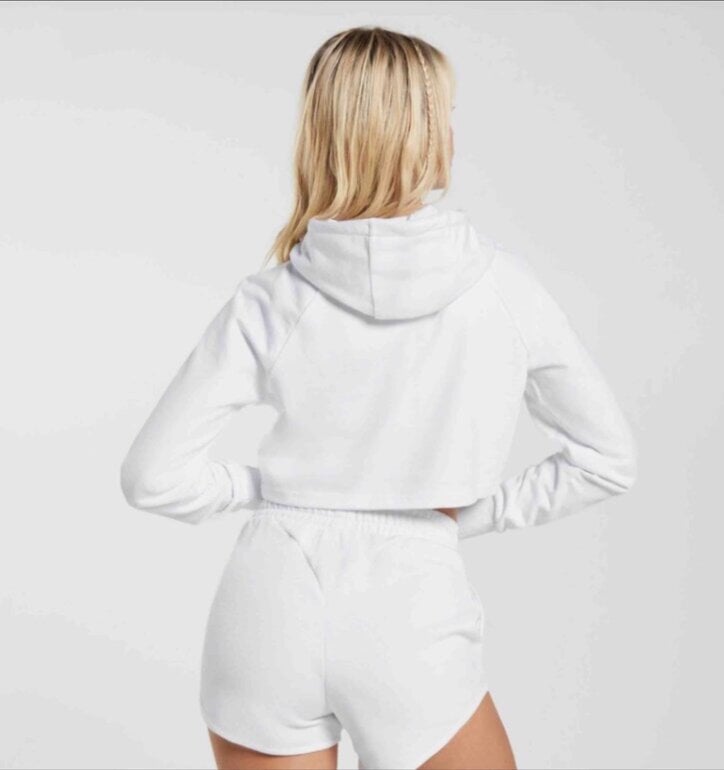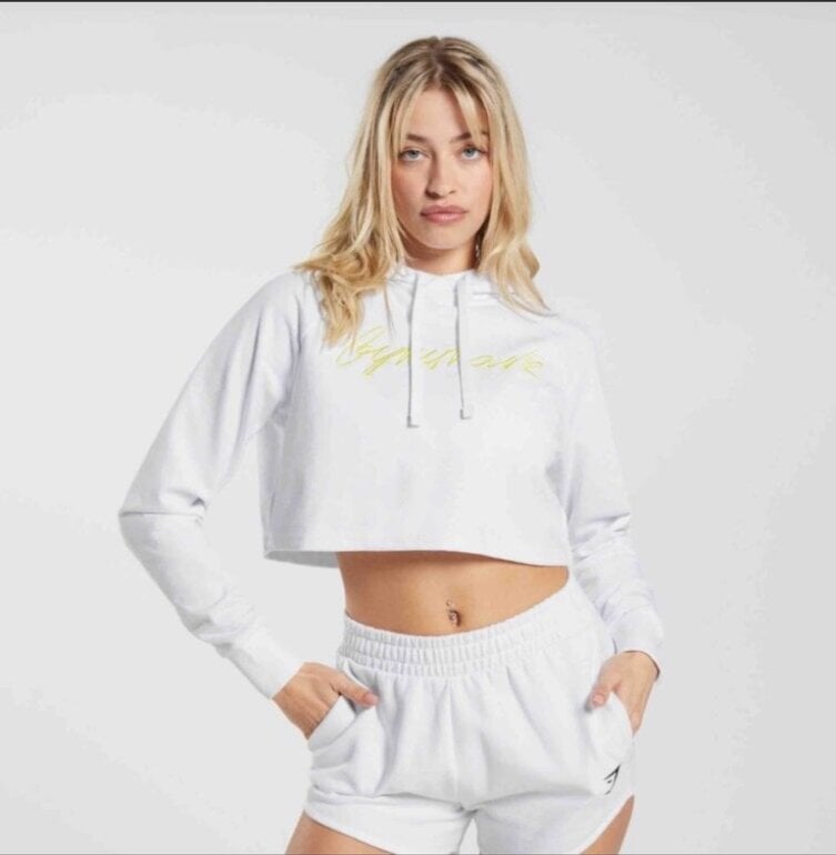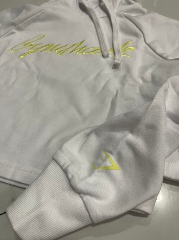 Sudadera blanca gymshark con diseño de letras al frente en color amarillo, resalta mucho Nueva y sin ningún detalle Súper básica en los outfits. Este modelo no trae etiqueta. Envío en su bolsita