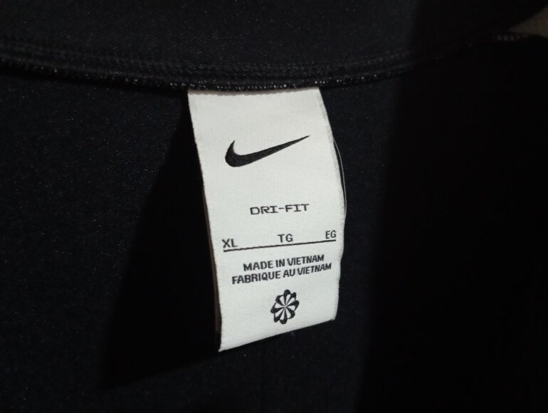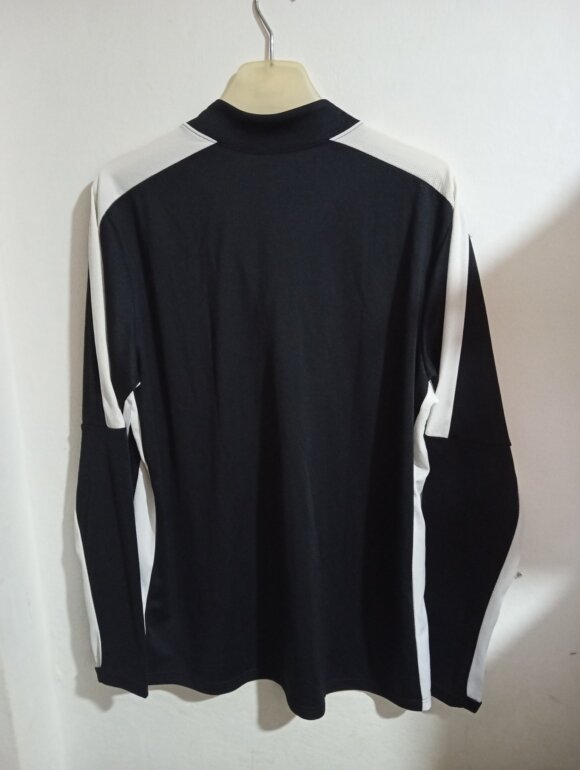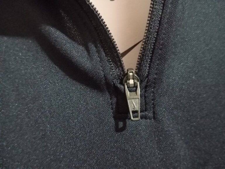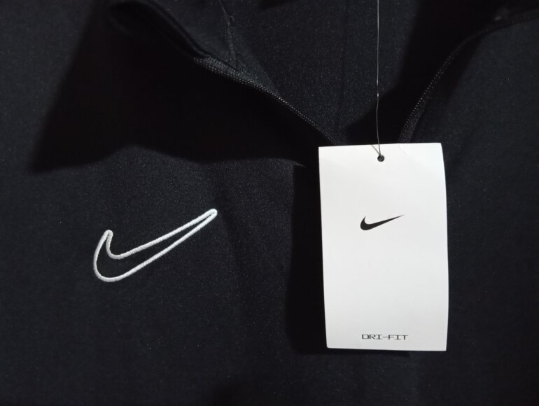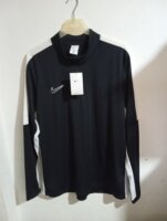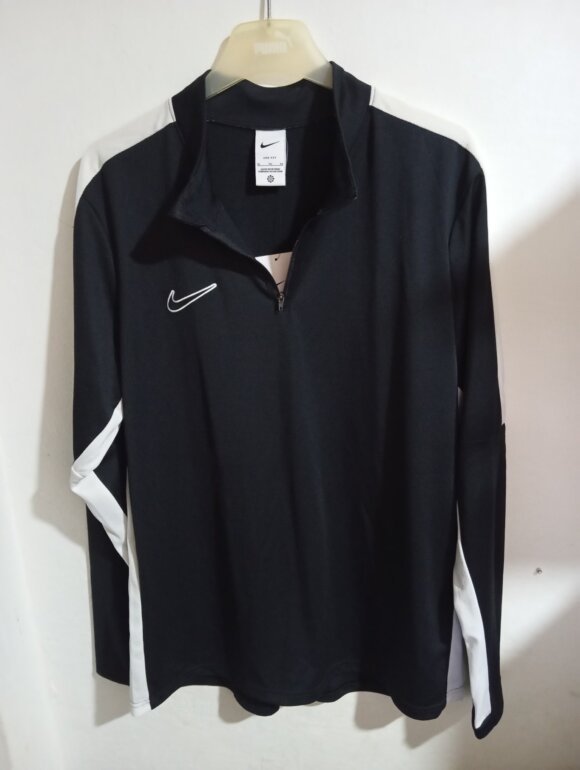 Sudadera deportiva negra de NIKE, color negro con líneas color blanco en hombro a los brazos y cintura, manga larga talla XL extra grande pero queda como L, con cierre metálico del cuello hasta el pecho, marca bordada en pecho, hecho de 100% poliéster. Nueva en perfectas condiciones.