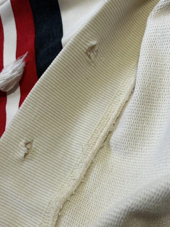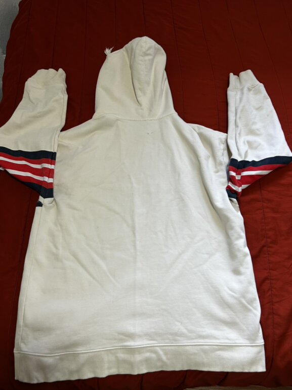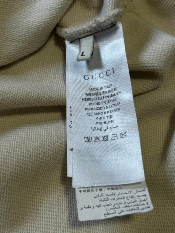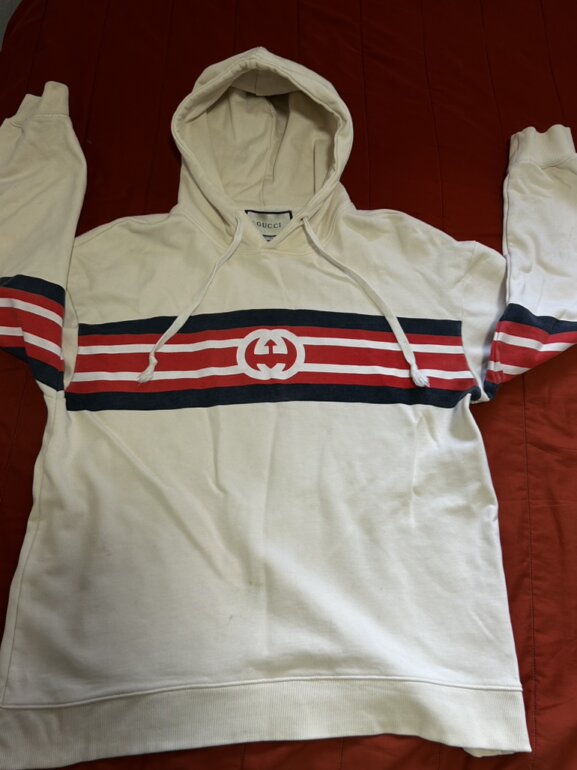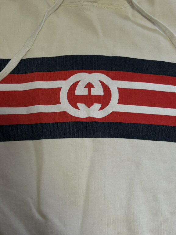 Sudadera Gucci original hecha en Italia. Es una prenda icónica con los colores clásicos de la marca y el logo de la doble G. Talla L, con un fit espectacular y tela de la más alta calidad. Aviso: La prenda cuenta con detalles (un par de agujeros pequeños en el resorte inferior y manchas leves al frente), por lo que se va a un precio de verdadera oportunidad.