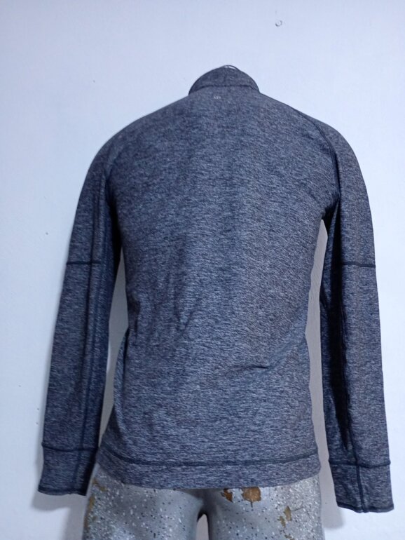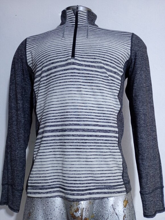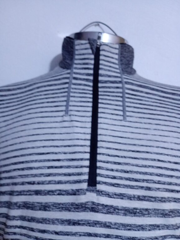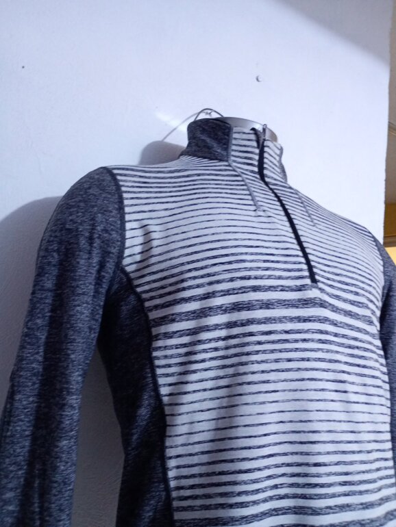 Bonita sudadera de medio cierre, Spandex. Color gris con partes frontal a rayas en gris y blanco. Una puesta, sin detalles. No trae etiqueta interna únicamente logotipo en espalda a la altura del cuello