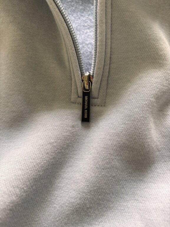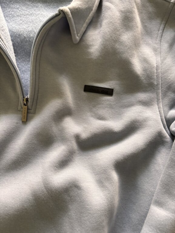 Modelo con cierre 1/4 y detalle de logo metálico al frente.