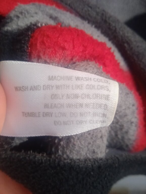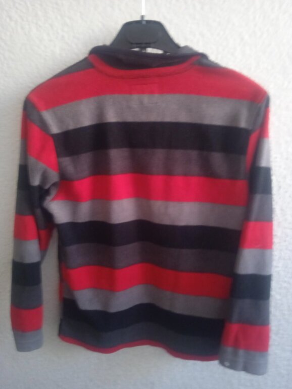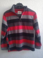 Sudadera de tela tipo polar (fleece) con rayas horizontales en rojo, gris y negro. Cuello alto con cierre funcional. Muy calientita.