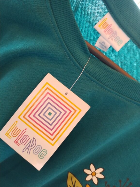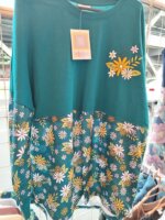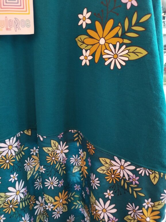 Es un suéter floreado color turquesa las flores son del ombligo para abajo muy bonito
