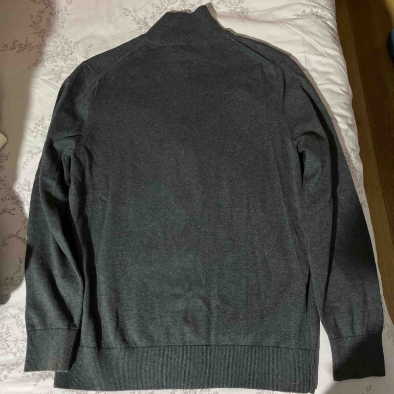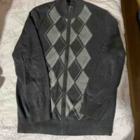 Suéter color gris con rombos al frente, se abre con cremallera, ligero y formal. Sin detalle alguno, una sola puesta.