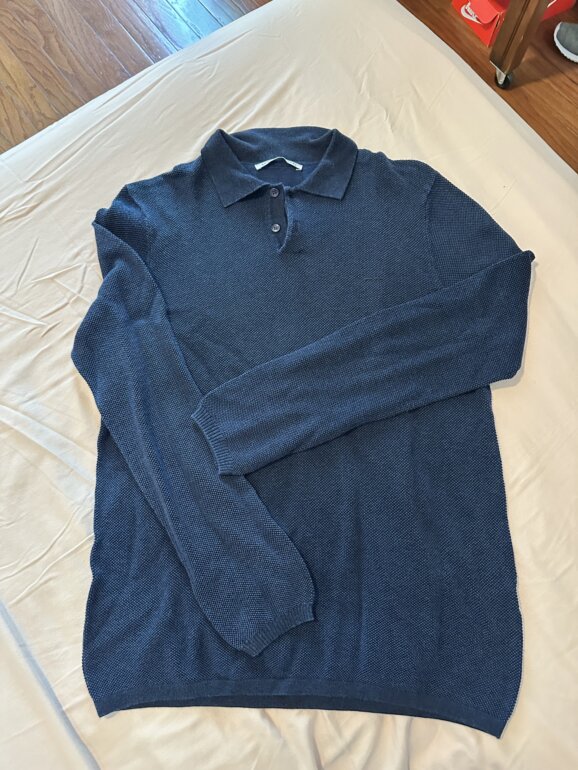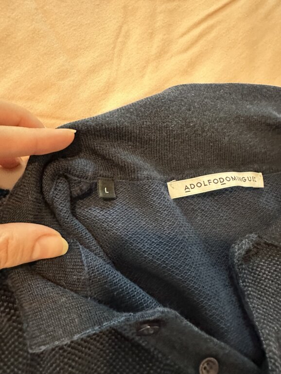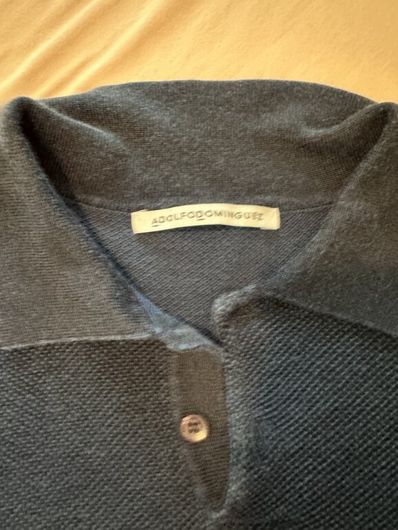 Talla: L. Marca: Adolfo Domínguez. Pieza: suéter tipo polo de manga larga en color azul marino, con tejido texturizado tipo punto. Cuello tipo polo con tapeta y botones al frente. Puños y dobladillo acanalados. Limpio de tntorería y bien conservado.