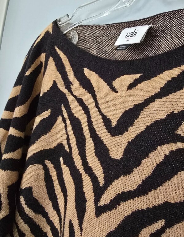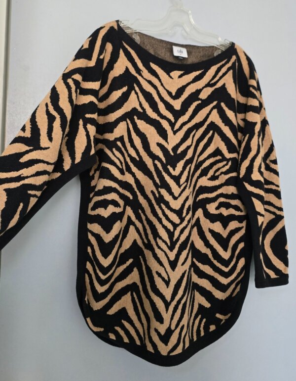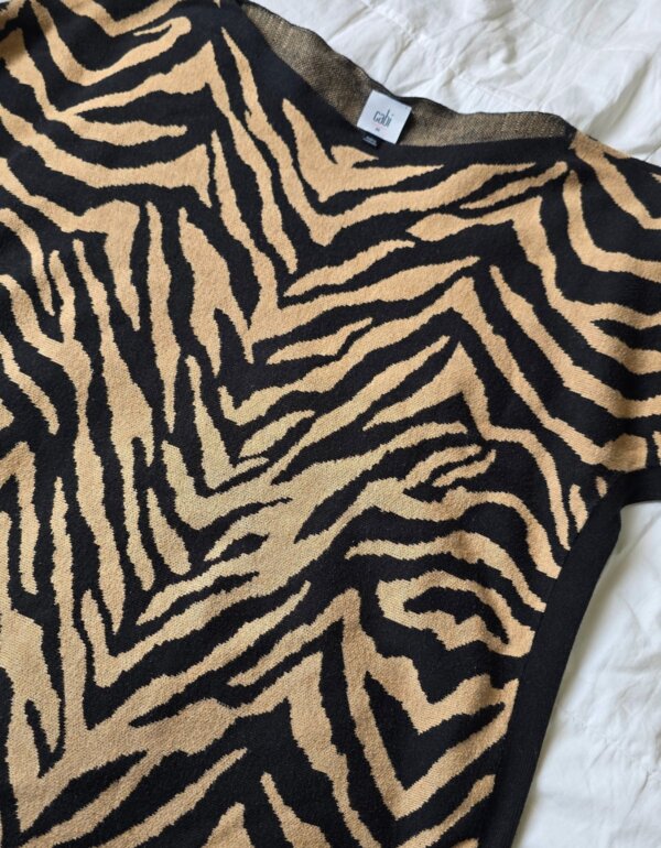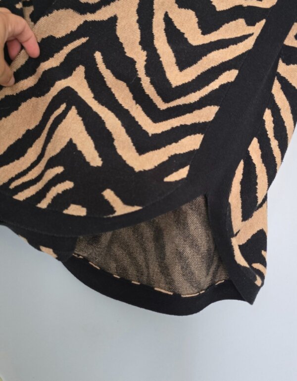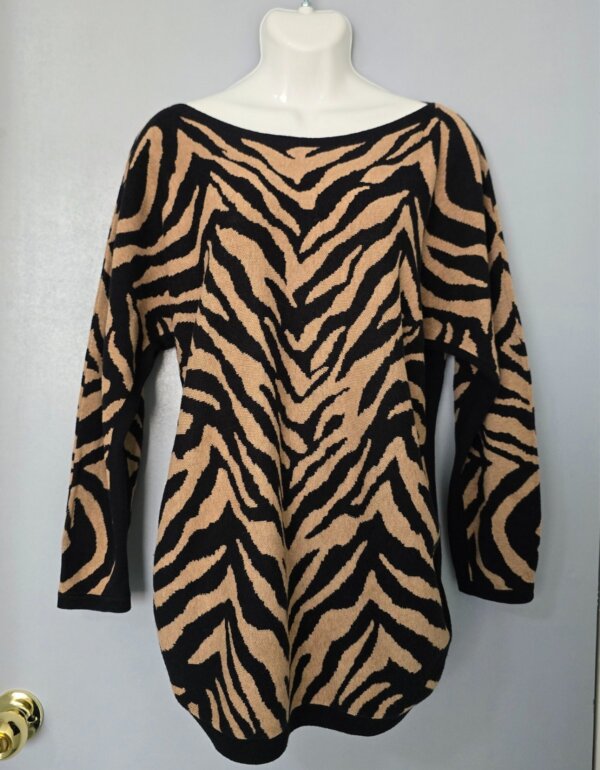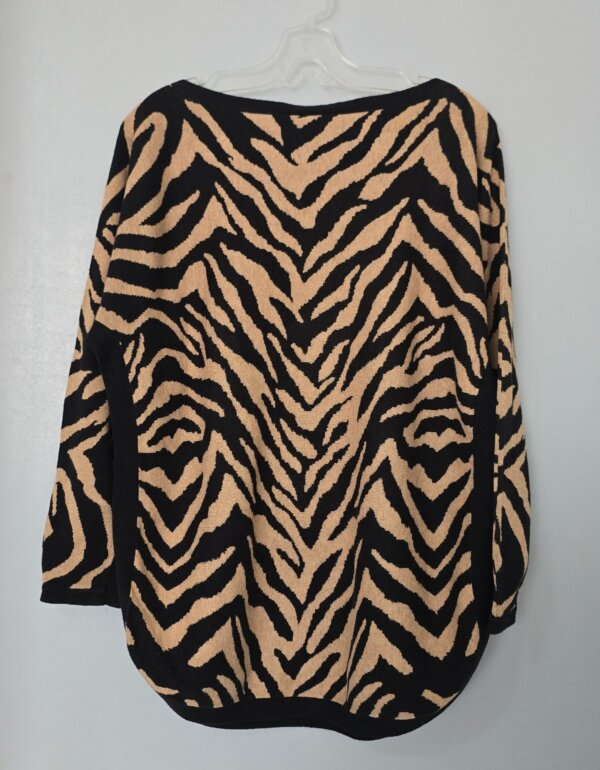 Suéter de punto en tonos negro y camel, con print tipo cebra. Corte holgado y cómodo, cuello barco y manga larga con caída relajada. Bajo redondeado que estiliza y da mejor caída. Ideal para entretiempo o clima fresco.