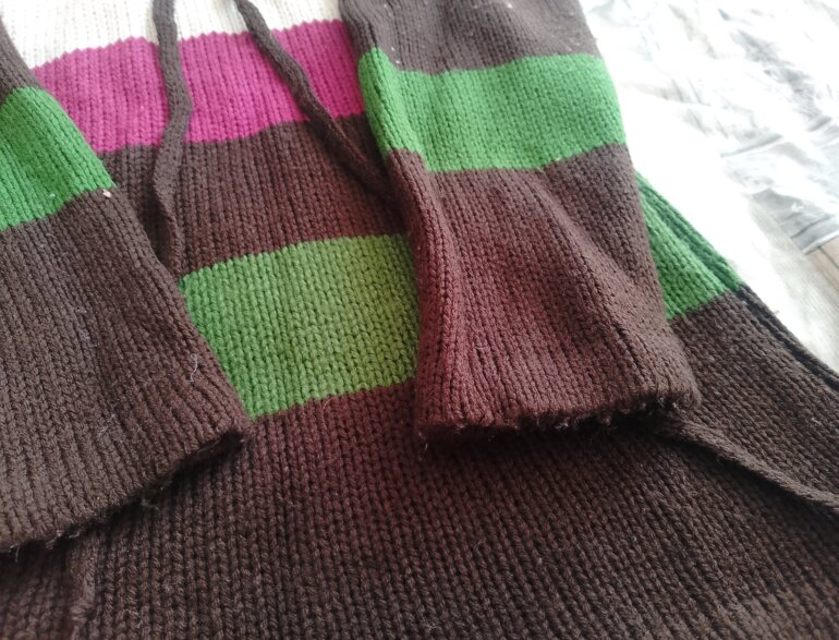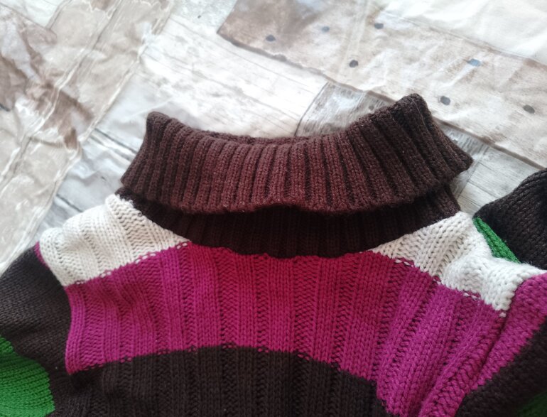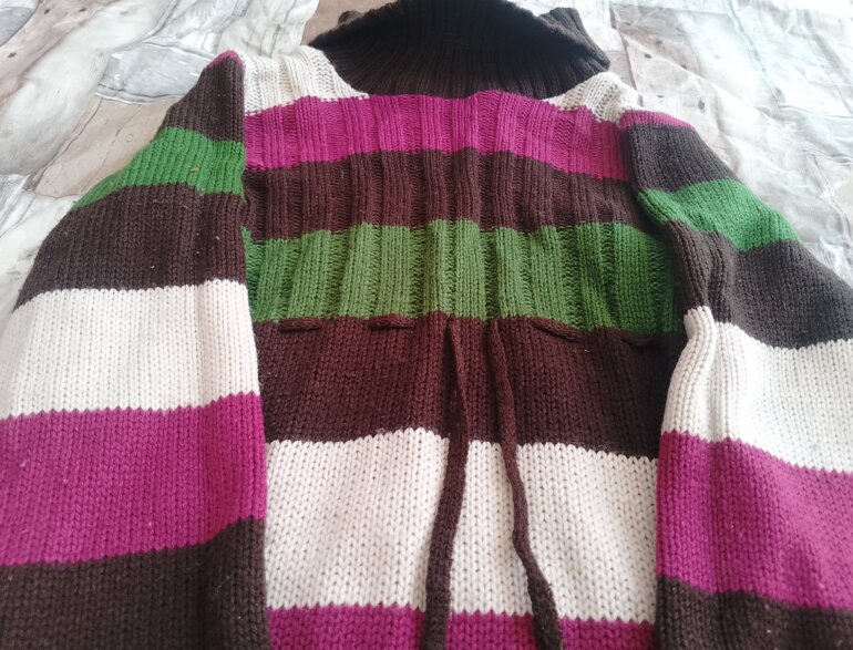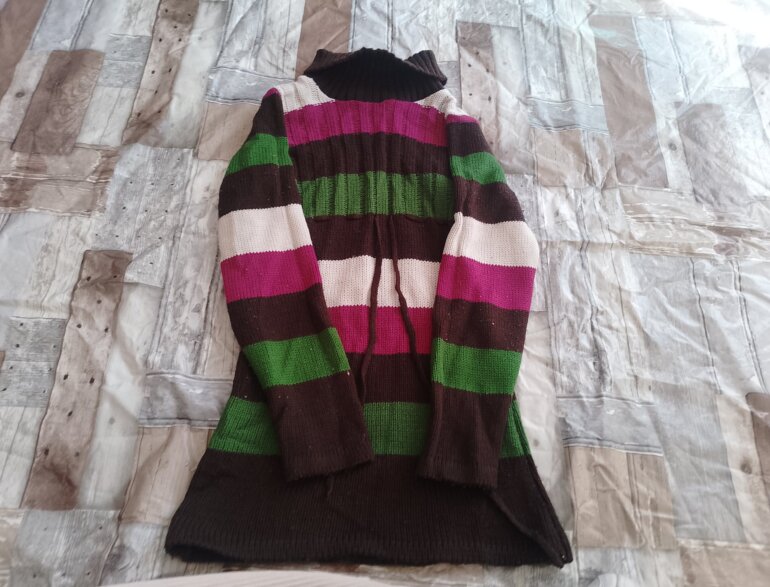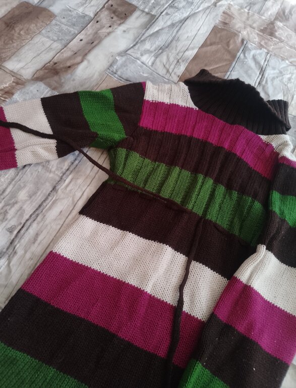 Blusón polar llega hasta las rodillas o arriba de ellas tiene su cinto para ajustar de la cintura ,tiene cuello de tortuga y la tela es gruesa como tejida