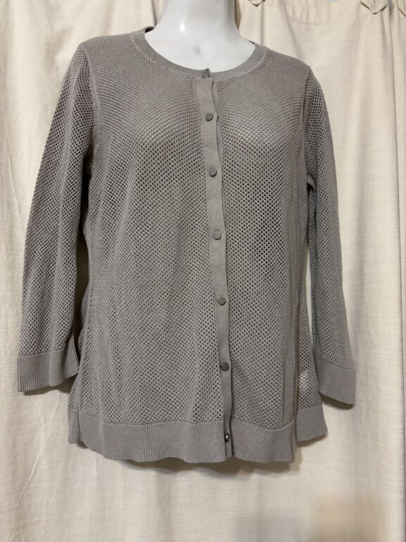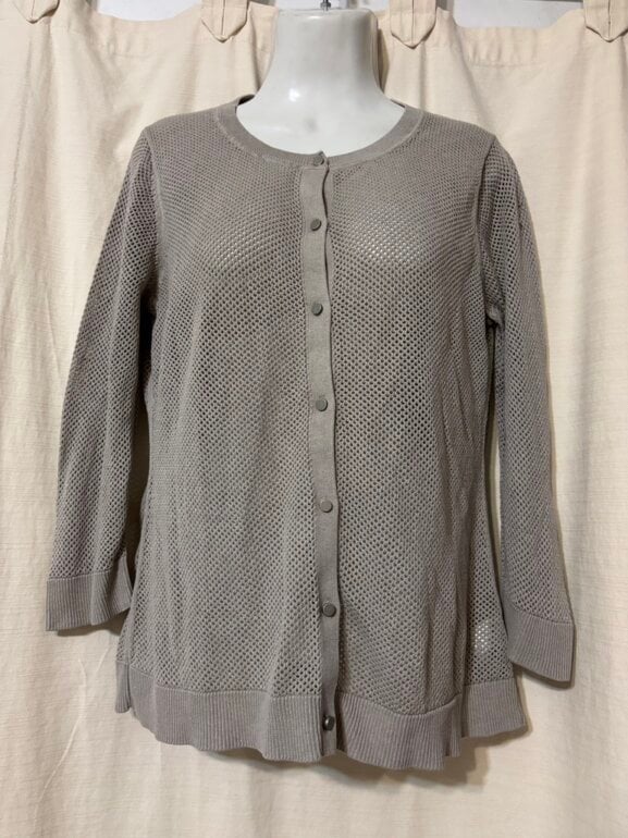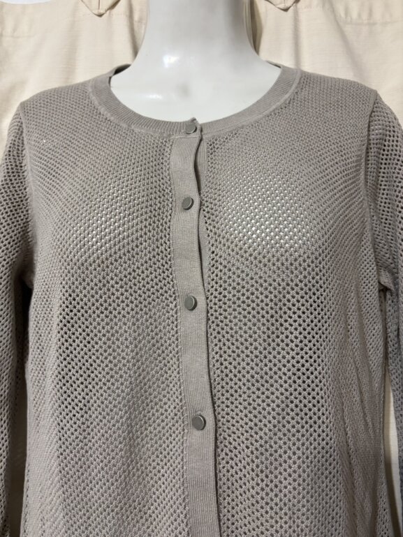 Suéter tipo cárdigan tejido de malla, botones metálicos, ideal para usar durante las estaciones de transición, como la primavera y el otoño, cuando el clima puede ser variable, o como una capa intermedia en climas más fríos, abotonado o abierto, con jeans o más formal, marca talla L mide de axila a axila 50 cm