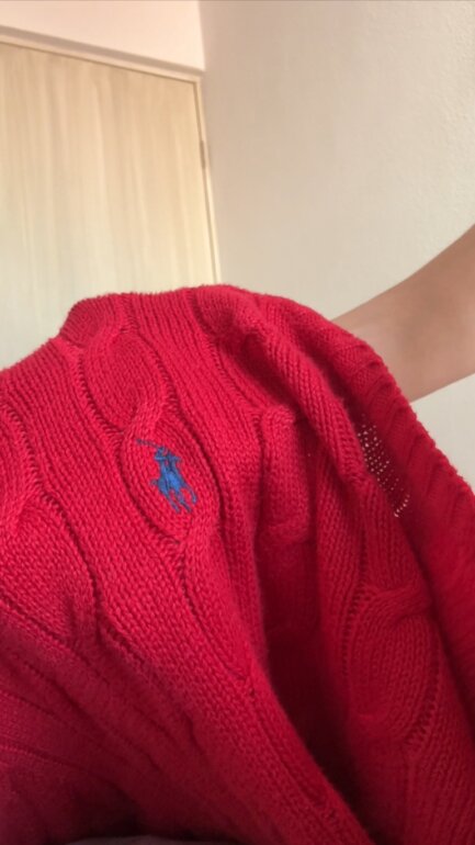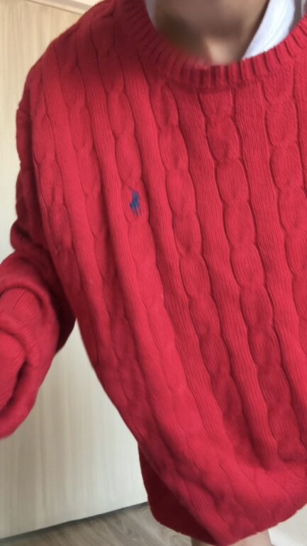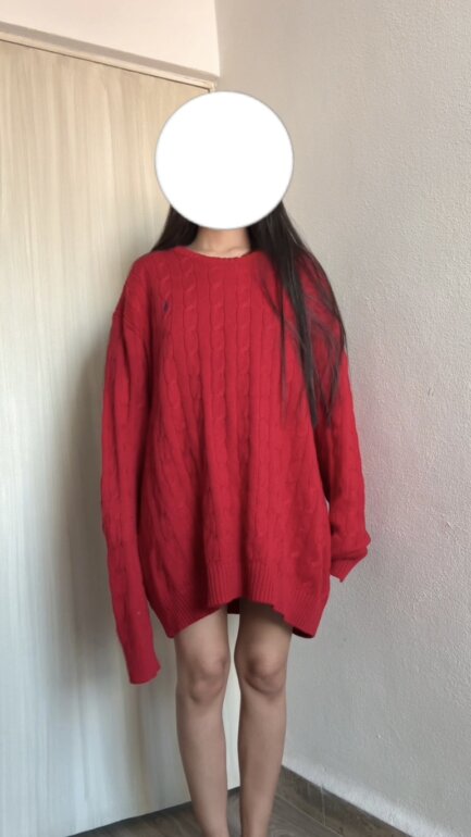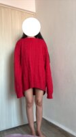 Suéter trenzado rojo: Prenda de tejido grueso y vibrante con un estilo marcadamente oversize; sus mangas largas y su caída relajada lo convierten en el protagonista ideal para un look cómodo y audaz.