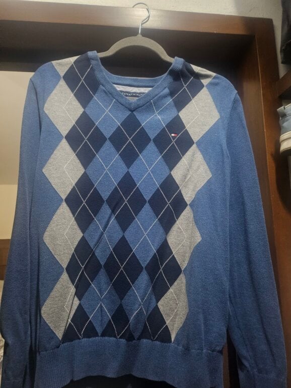 Suéter de hombre tejido, delgado con rombos.