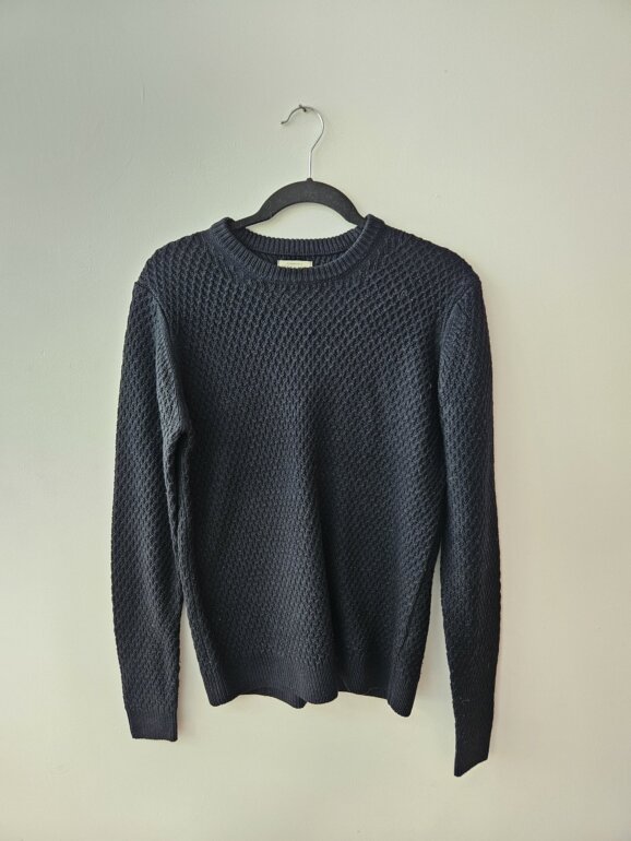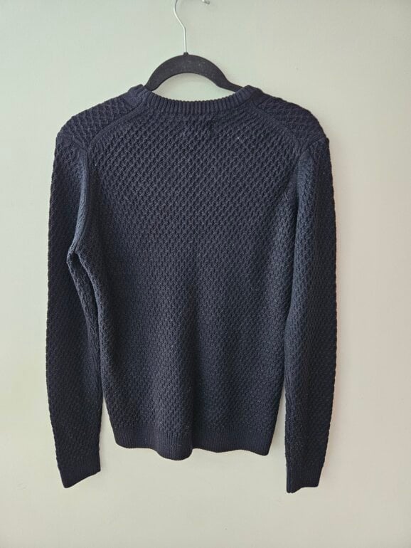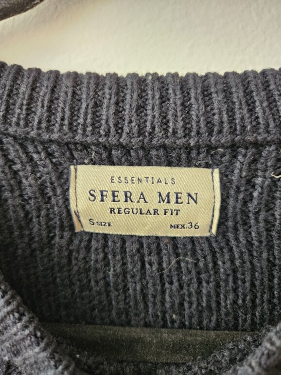 Sueter tejido y cuello redondo manga larga, modelo regular fit color azul marino marca Sfera ORIGINAL. NO tiene detalles importantes (no está roto, desgastado deslavado). En perfecto estado.Es talla S de caballero.