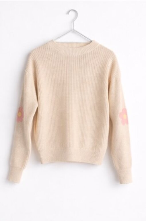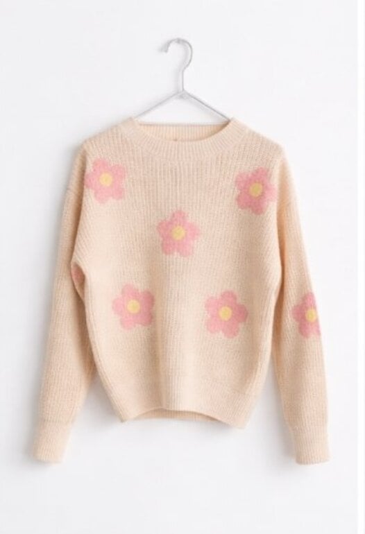 Suéter de tejido suave en tono crema, decorado con delicadas flores rosas con centro amarillo que le dan un aire dulce y femenino. Cuenta con cuello redondo clásico, mangas largas y terminaciones acanaladas en cuello, puños y dobladillo para un mejor ajuste. Su textura tejida aporta calidez sin perder ligereza, ideal para looks casuales y románticos.