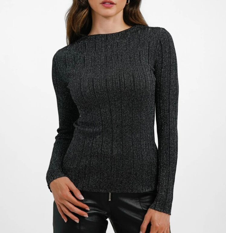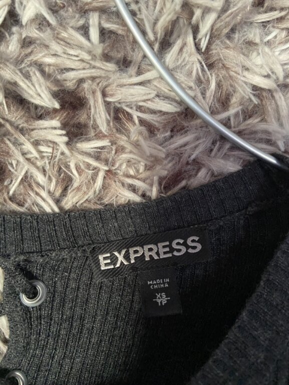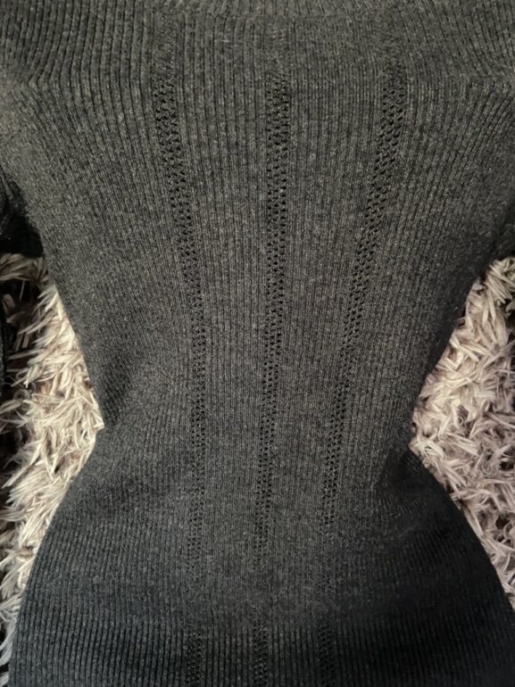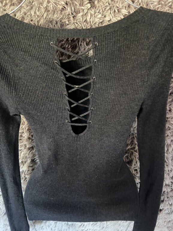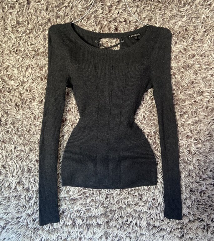 ✨(1era imagen similar) sueter tipo blusa color gris oscuro, acanalado de tejido, cuello redondo y escote criss cross posterior, manga larga, talla ideal XS/S [no encontré la marca] ♻️Envio en cajas recicladas