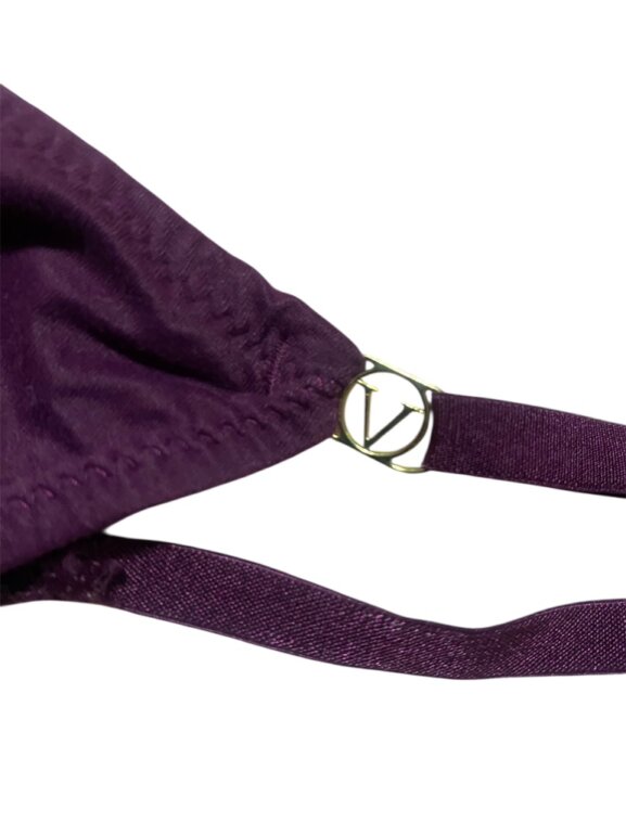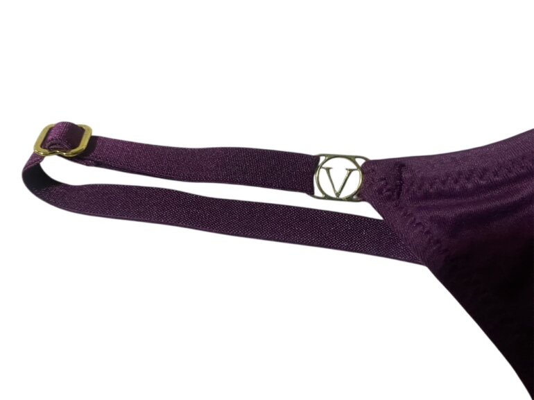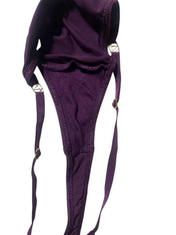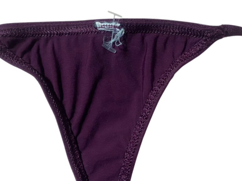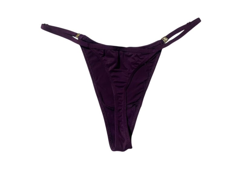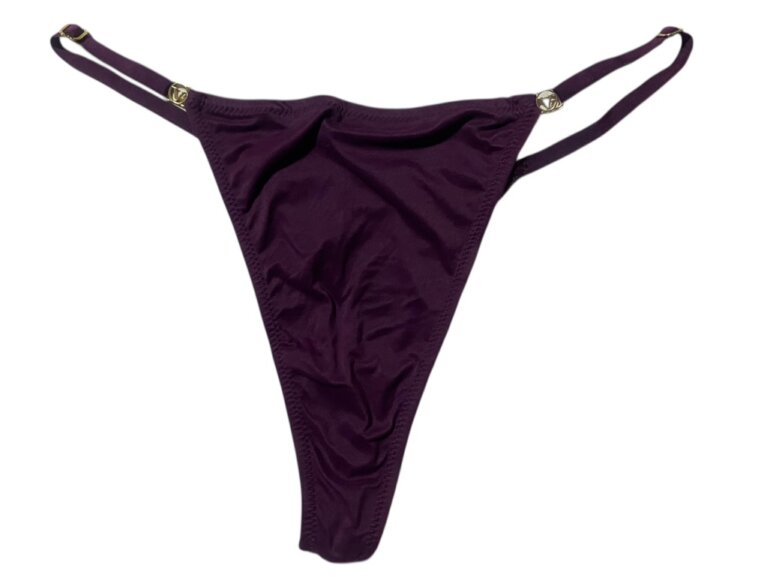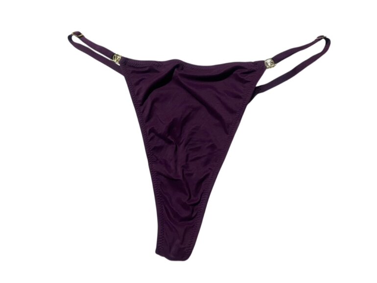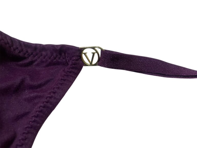 Tanga de la marca Victoria’s Secret, color morado, con herrajes de la marca y ajuste para el tamaño, por error se corto la etiqueta