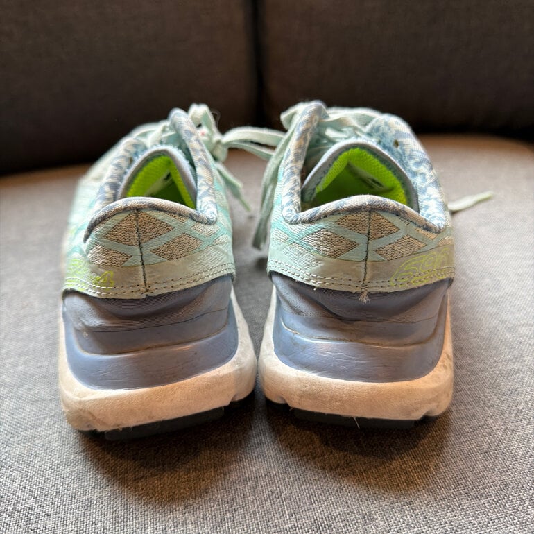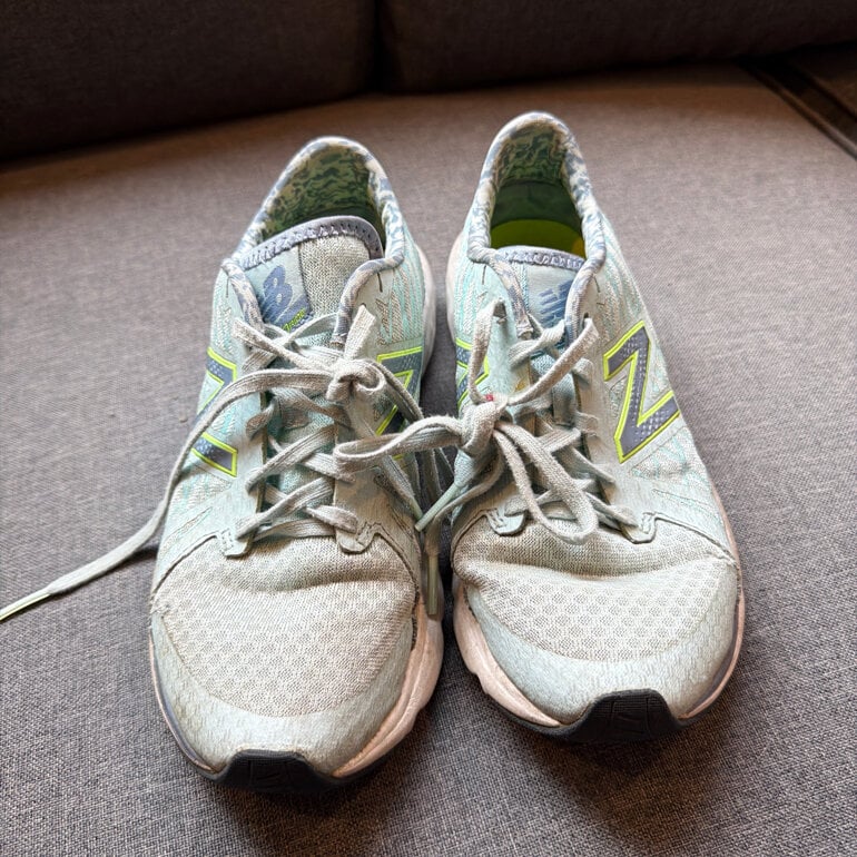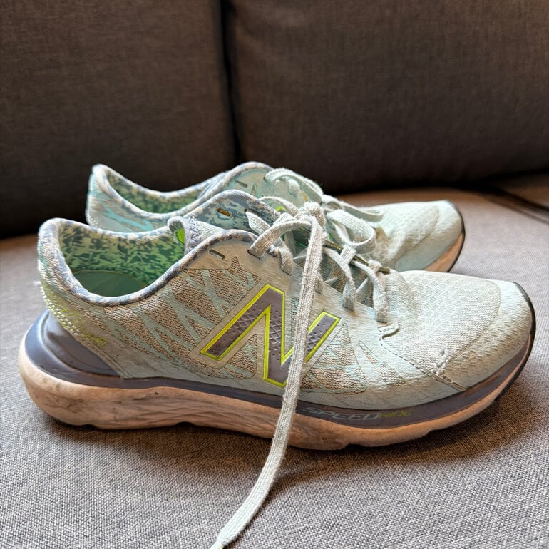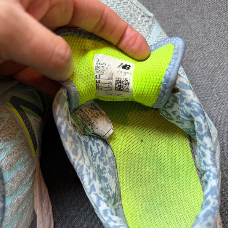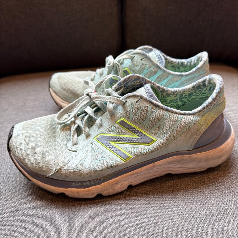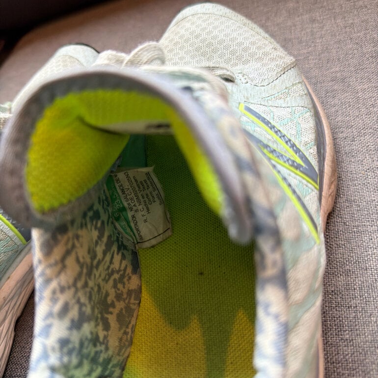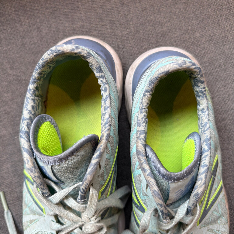 Tenis new balance azules con verde, algunos detalles en la tela pero aún pueden tener una vida de uso
