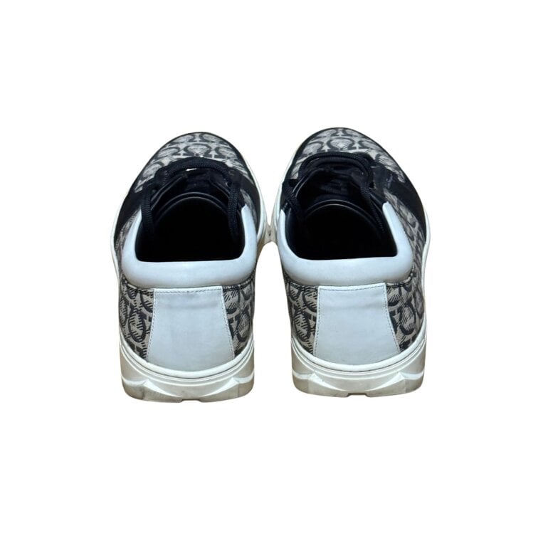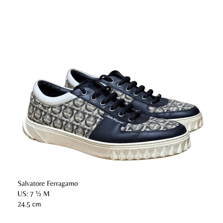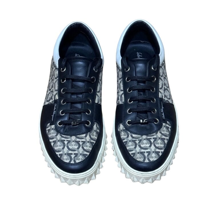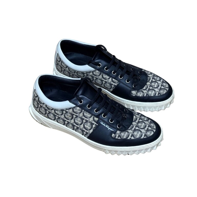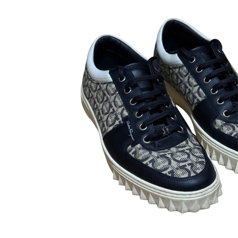 Tenis originales Salvatore Ferragamo, confeccionados en Italia con combinación de piel y canvas monograma icónico de la casa. Diseño sofisticado, elegante y atemporal que eleva cualquier outfit casual a nivel lujo contemporáneo.