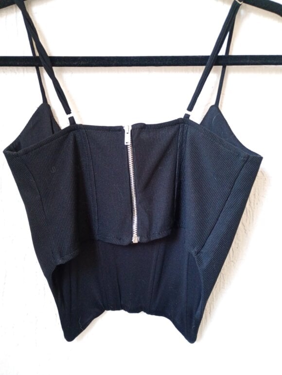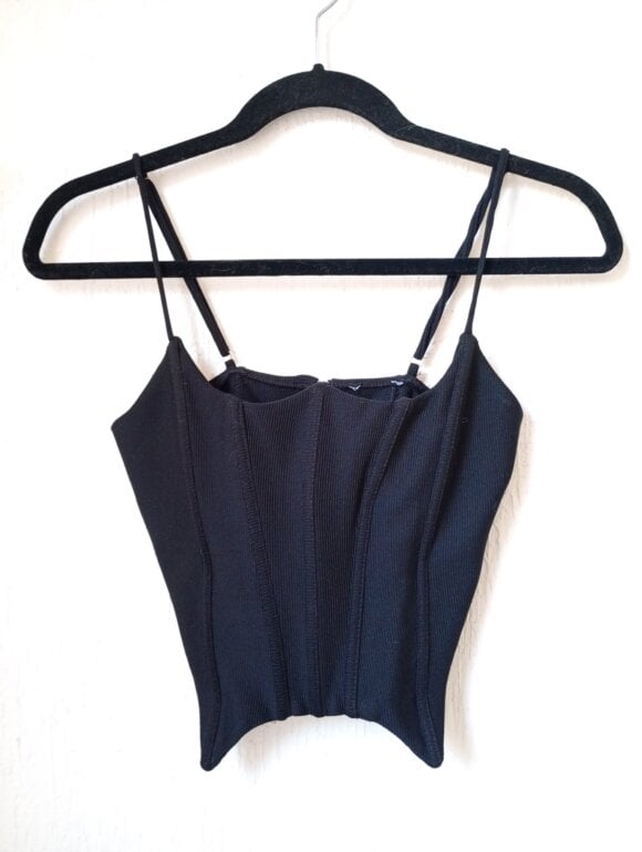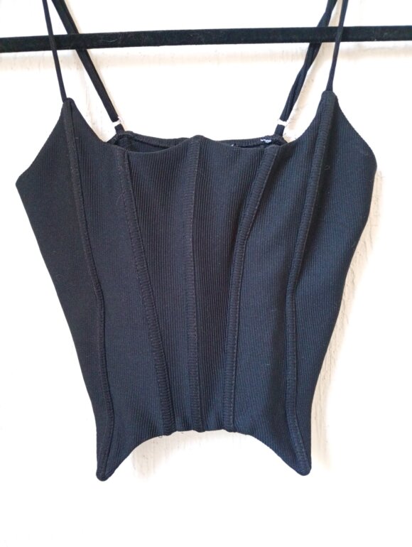Top estilo corset, tiene varillas y cierre en la parte de atrás. Los tirantes son ajustables. Queda justo. se ha usado un par de veces. No tiene detalles.